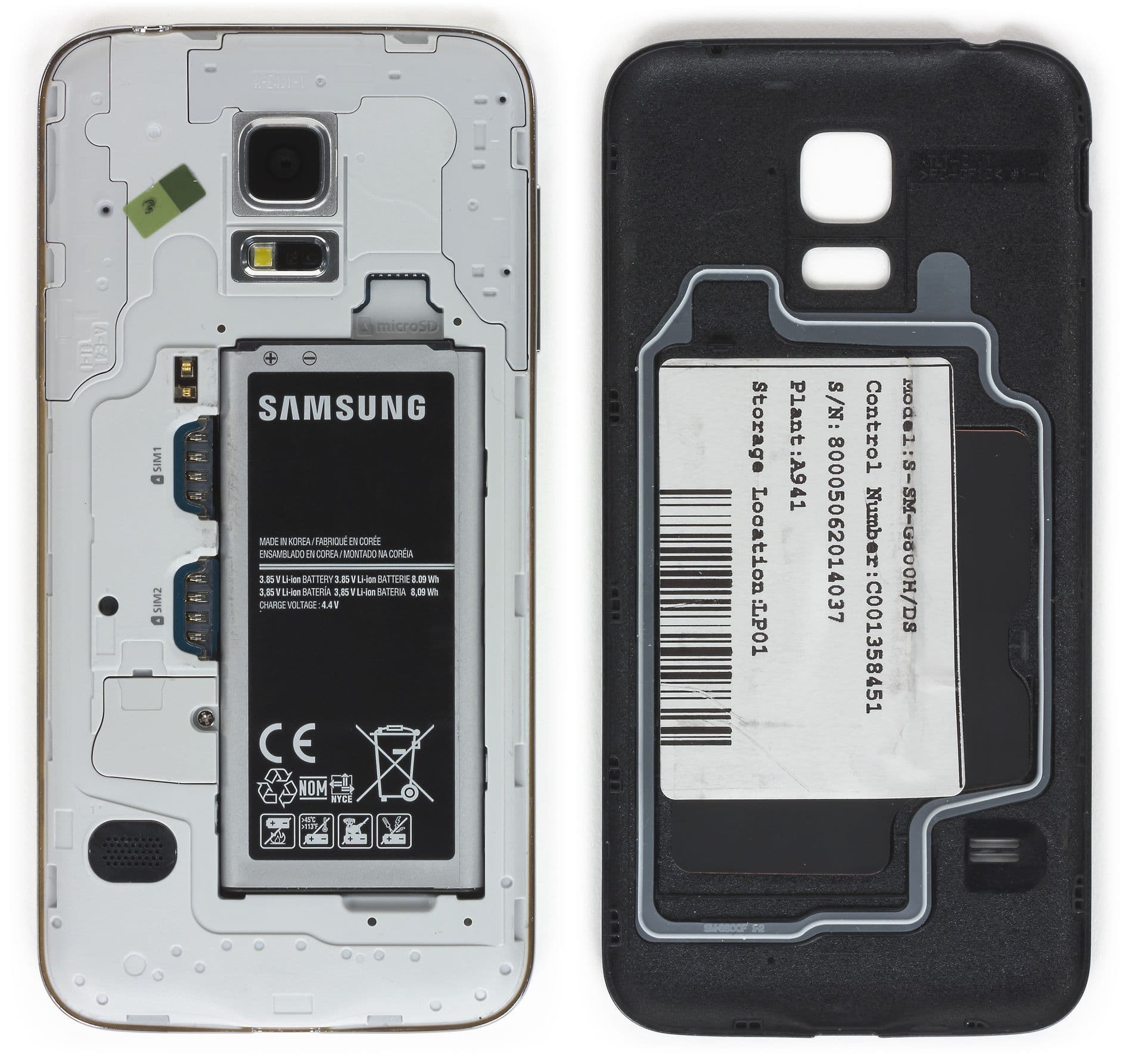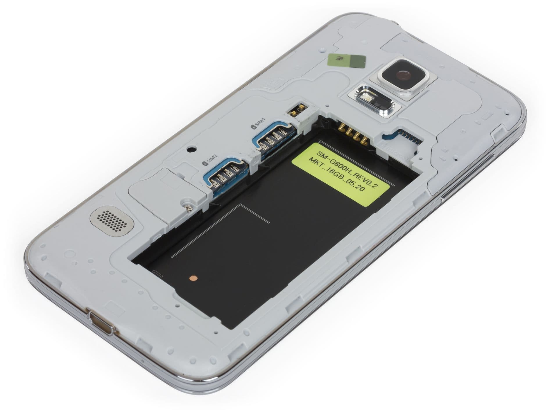 Задняя крышка у нового смартфона, как и у флагманского S5, съемная, под ней скрываются слоты для карты памяти и SIM-карт. В данном случае здесь поддерживается работа с двумя SIM-картами формата Micro-SIM, поэтому слотов под крышкой целых три штуки, а в названии модели можно обнаружить дополнительную приставку «Duos», хотя есть в ассортименте корейской компании и модификация с одной SIM-картой (модель SM-G800F).