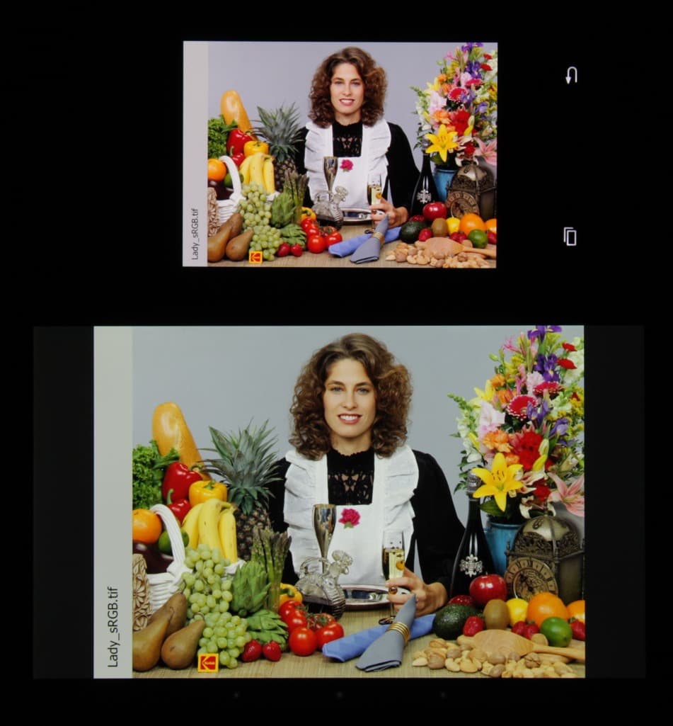 Оптимизировать дисплей — насыщенность цветов высокая, но оттенки кожи несколько пострадали. Динамичный — насыщенность, контраст и цветовой контраст высокие, кожа излишне красноватая. Стандартный — промежуточный вариант между предыдущими двумя профилями. Профессиональная фотография — насыщенность высокая, но контраст и цветовой контраст в норме, кожа излишне красноватая. Кинотеатр — насыщенность цветов наименьшая.