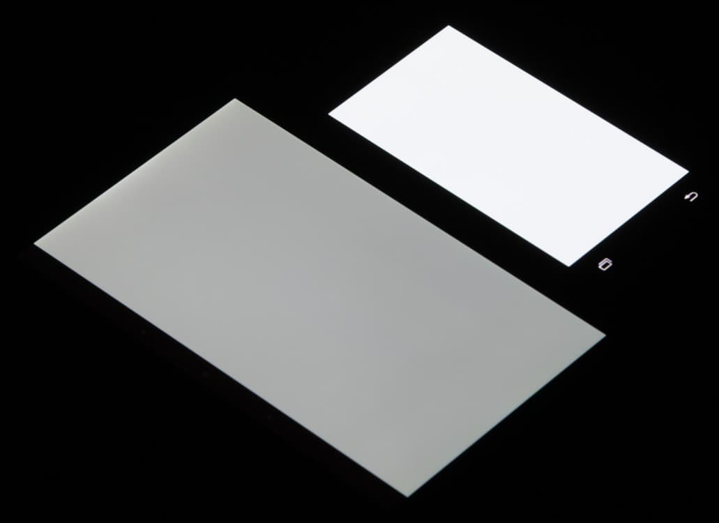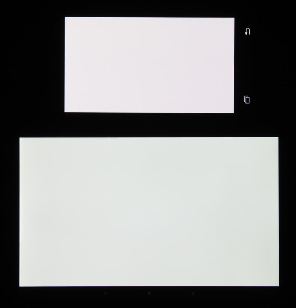 Экран характеризуется великолепными углами обзора. Правда, белый цвет при отклонении даже на небольшие углы приобретает очень легкий сине-зеленый оттенок, но черный цвет остается просто черным под любыми углами. Он настолько черный, что параметр контрастности в данном случае неприменим. При перпендикулярном взгляде равномерность белого поля отличная. Для сравнения приведем фотографии, на которых на экраны Samsung Galaxy S5 mini (профиль Кинотеатр) и второго участника сравнения выведены одинаковые изображения, при этом яркость экранов изначально установлена примерно на 200 кд/м², а цветовой баланс на фотоаппарате принудительно переключен на 6500 К. Белое поле: