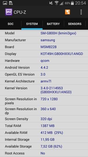 Аппаратная платформа Samsung Galaxy S5 mini строится на базе давно и хорошо знакомой нам однокристальной системы (SoC) Qualcomm Snapdragon 400. Центральный процессор здесь имеет 4 ядра ARM Cortex-A7, работающих на частоте 1,4 ГГц (технология производства SoC — 28 нм). Оперативной памяти в устройстве 1,5 ГБ (это, пожалуй, единственное заметное отличие Galaxy S5 mini от одноклассников), а хранилище, доступное пользователю для загрузки собственных файлов, составляет около 11 ГБ из номинально обозначенных 16 ГБ — остальное ушло на саму систему и приложения. Память можно нарастить за счет карточек microSD объемом до 64 ГБ. А вот подключить флэш-накопитель через OTG-переходник здесь не получится, и этим аппарат отличается не только от старших моделей в арсенале Samsung (Galaxy Alpha и др.), но и от прямых конкурентов, таких как HTC One mini 2.
