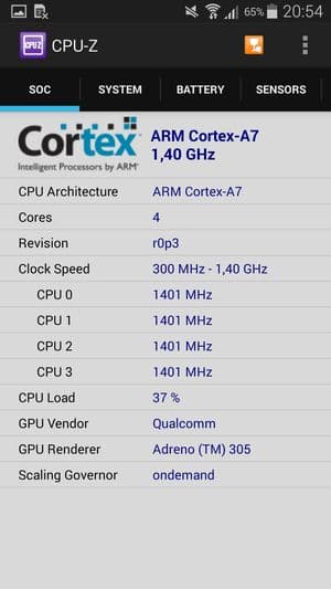 - SoC Qualcomm Snapdragon 400 (MSM8228), 1,4 ГГц, 4 ядра ARM Cortex-A7