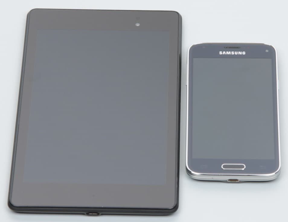 Лицевая поверхность экрана выполнена в виде стеклянной пластины с зеркально-гладкой поверхностью, устойчивой к появлению царапин. Судя по отражению объектов, антибликовые свойства экрана может чуть хуже, чем у экрана Google Nexus 7 (2013) (далее просто Nexus 7). Для наглядности приведем фотографию, на которой в выключенных экранах отражается белая поверхность (слева — Nexus 7, справа — Samsung Galaxy S5 mini, далее их можно различать по размеру):