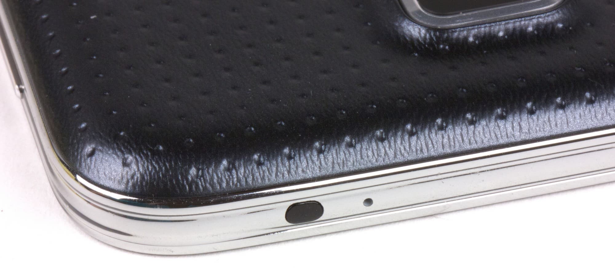 На нижнем торце разъем USB 3.0 прикрыт металлизированной крышкой с резиновой прокладкой — она защищает смартфон от попадания внутрь пыли и влаги. Да-да, новый флагман линейки Galaxy S наконец-то обзавелся пылевлагозащитой по стандарту IP67. В принципе, имелась она и у предыдущей модели, но там это было отдельное ответвление линейки под названием Galaxy Active. Защита в аппарате Galaxy S5 устроена так же, как там: к внутренней поверхности задней крышки приклеили резиновую проладку, а разъемы закрываются специальными заглушками. Приятно, что каждый раз, когда надевается задняя крышка или вынимается штекер из разъема Micro-USB, смартфон сам напоминает о необходимости закрыть защитные крышки (напоминание можно отключить).