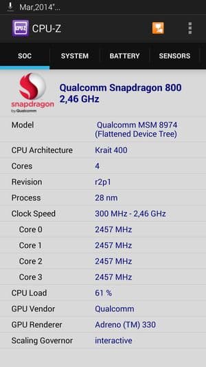 - SoC Qualcomm Snapdragon 801 (MSM8974AC), 4 ядра Krait 400, 2,5 ГГц