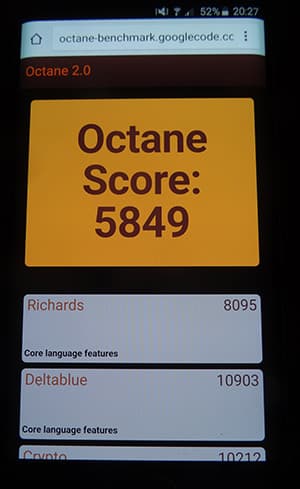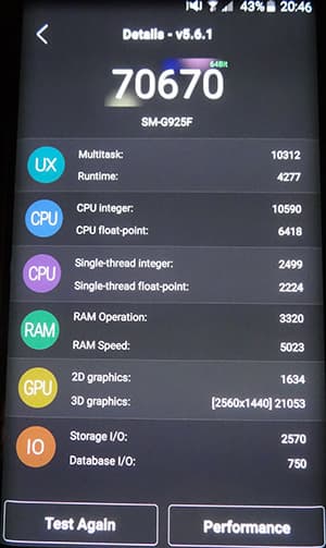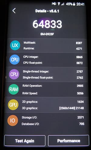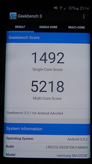 Javascript-тесты позволяют провести хоть какое-то сравнение производительности с iPhone 6. В Google Octane смартфон Samsung отстает от iPhone 6 (6256 баллов) совсем немного, а вот разница с iPhone 6 Plus (7056 баллов) весьма значительна. В Mozilla Kraken продукты Apple оказываются быстрее уже на четверть. По производительности одного ядра Samsung уступает iPhone, но по производительности всех ядер обходит «яблочных» конкурентов в два раза. Что, мягко говоря, объяснимо соотношением количества ядер в этих смартфонах. Впрочем, в любом случае браузерные тесты слишком сильно зависят от производительности собственно браузера, чтобы делать на их основании далеко идущие выводы.