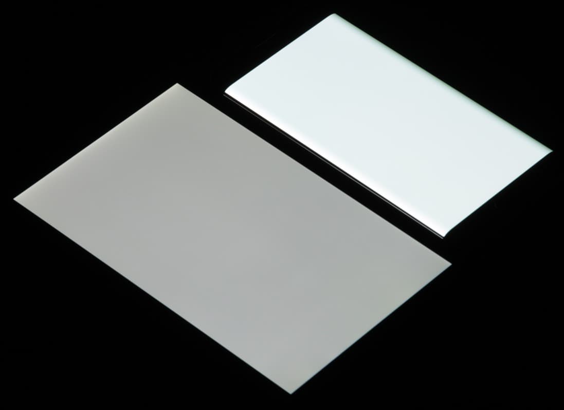 Лицевая поверхность экрана выполнена в виде стеклянной пластины с зеркально-гладкой поверхностью, устойчивой к появлению царапин. Судя по отражению объектов, антибликовые свойства экрана не хуже, чем у экрана Google Nexus 7 (2013) (далее просто Nexus 7). Для наглядности приведем фотографию, на которой в выключенных экранах отражается белая поверхность (слева — Nexus 7, справа — Samsung Galaxy S7 Edge, далее их можно различать по размеру):