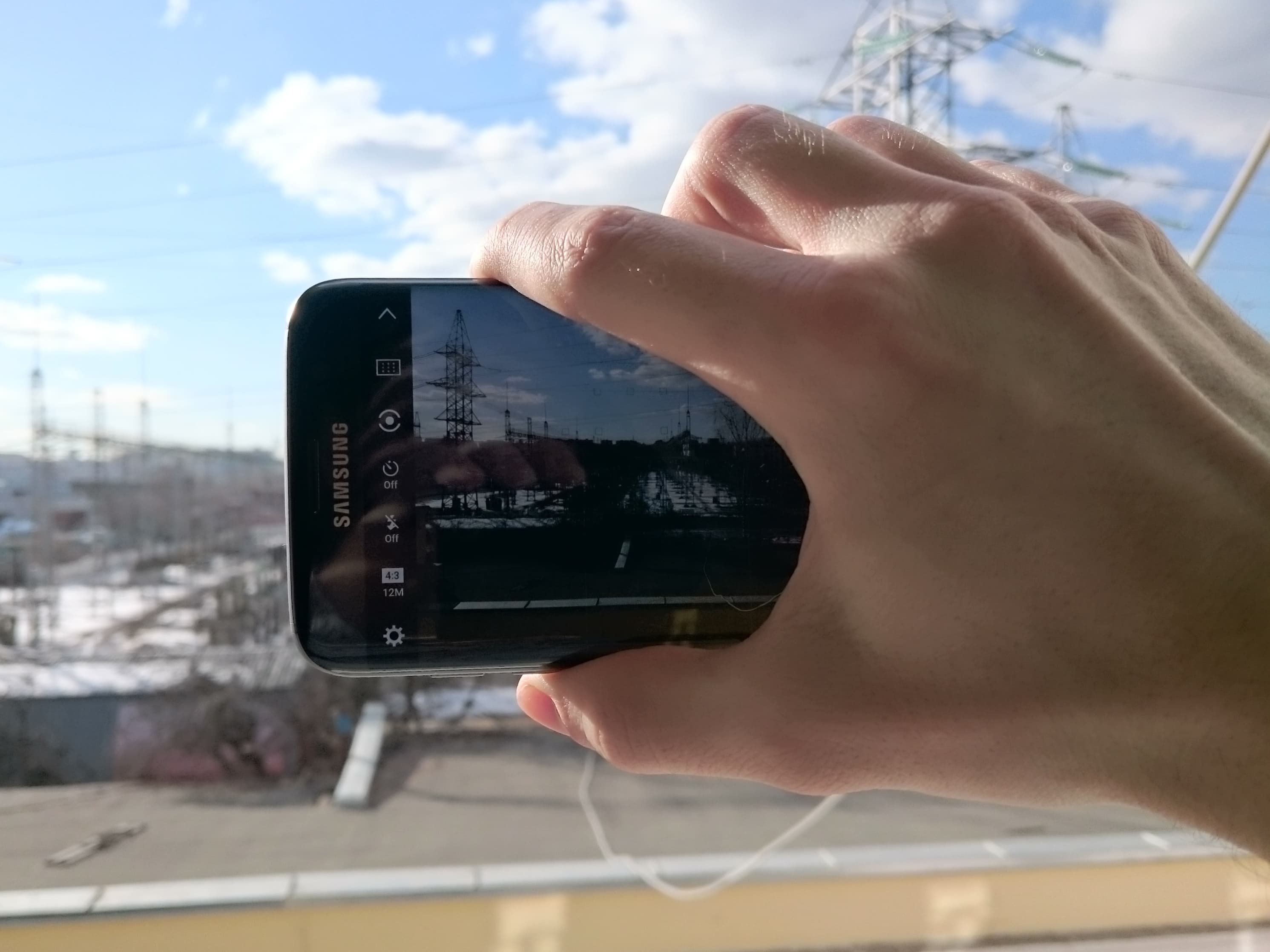 Раз уж речь зашла про удобство, стоит отметить проблемы при съемке одной вполне стандартной рукой. Поскольку в использовании была модификация Edge, приходилось аккуратно обходиться с чувствительными краями. (Вообще, эти «эджи» нередко создают некоторый дискомфорт при использовании, хотя если хочется, то ради дизайна к ним можно привыкнуть.) Если обхватить смартфон так, как это приходится делать с большинством планшетофонов, пальцы зачастую «занимают» сенсор, и кнопка спуска перестает реагировать на нажатия.