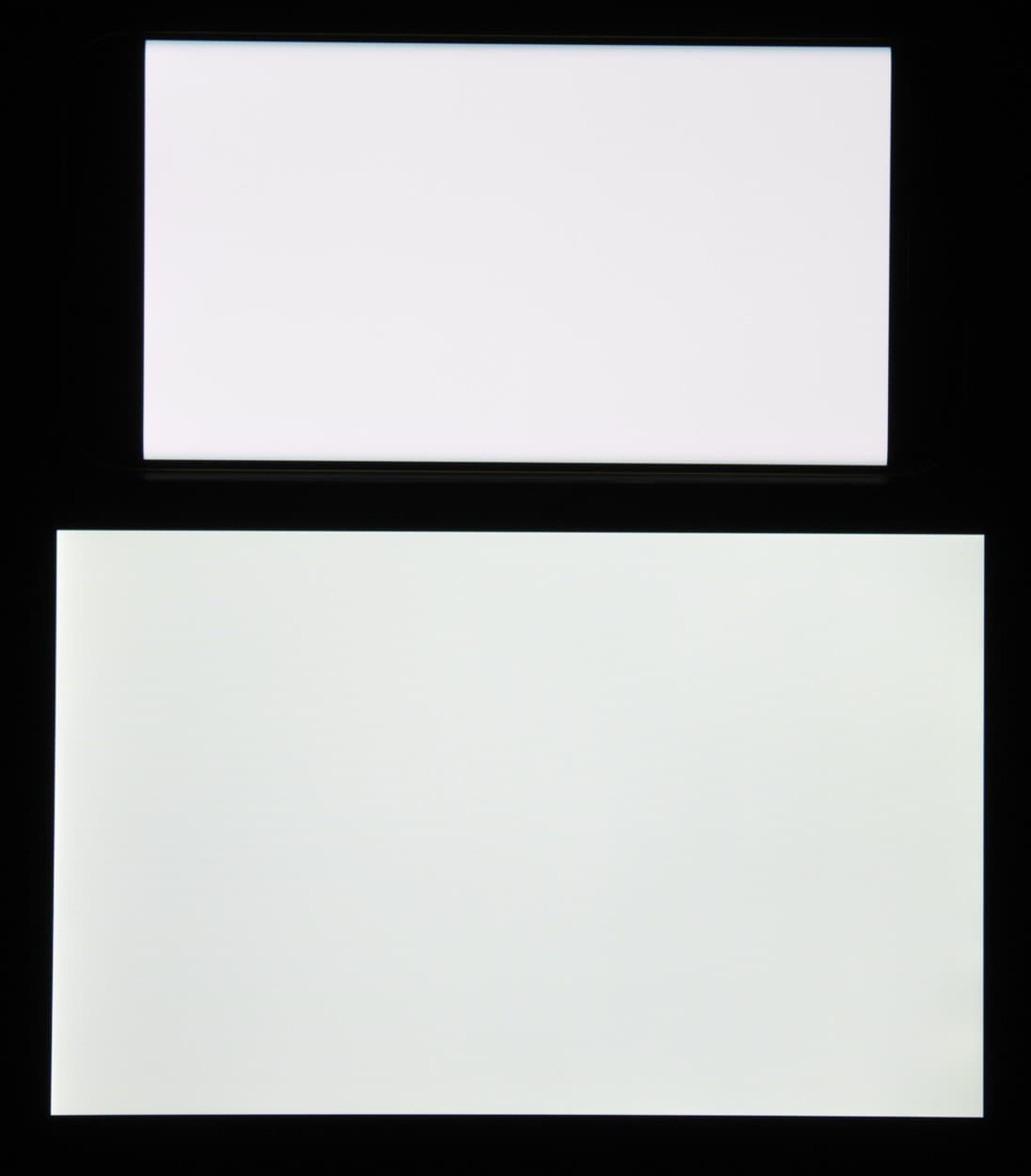 Экран характеризуется великолепными углами обзора. Правда, белый цвет при отклонении даже на небольшие углы поочередно приобретает легкий сине-зеленый и розоватый оттенок, но черный цвет остается просто черным под любыми углами. Он настолько черный, что параметр контрастности в данном случае неприменим. При перпендикулярном взгляде равномерность белого поля отличная. Для сравнения приведем фотографии, на которых на экраны Samsung Galaxy S7 Edge (профиль Основной) и второго участника сравнения выведены одинаковые изображения, при этом яркость экранов изначально установлена примерно на 190 кд/м², а цветовой баланс на фотоаппарате принудительно переключен на 6500 К. Белое поле: