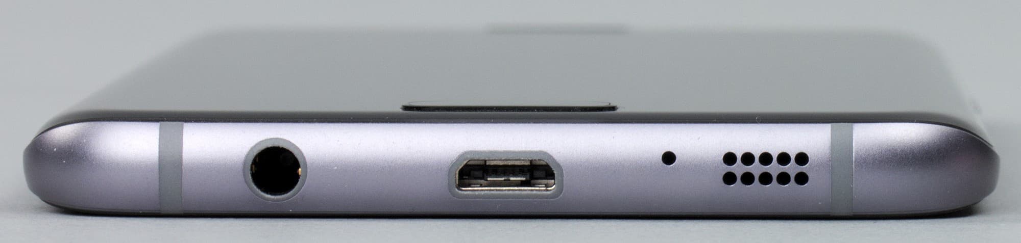 На нижней грани — динамик, разъем Micro-USB с поддержкой OTG (странно, что Samsung не переходит на USB Type C, в отличие от многих других производителей), разъем 3,5 мм для гарнитуры и отверстие встроенного микрофона. Любопытно, что расположение этого отверстия изменилось, то есть внутри, видимо, внутренняя компоновка компонентов претерпела существенные изменения. Что касается динамика, то его максимальная громкость вполне достаточная и для того, чтобы не пропустить звонок/будильник, и для просмотра фильмов или видеороликов, но для прослушивания музыки его, конечно, использовать не стоит по причине лишних призвуков и не очень приятного характера звучания в целом. Впрочем, было бы странно ожидать от устройства такого форм-фактора что-то иное.