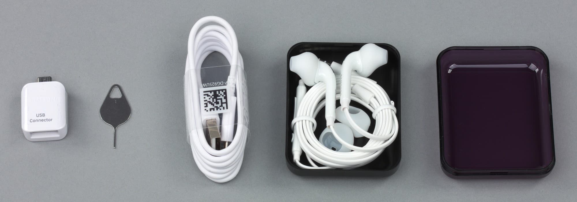 Это зарядное устройство с поддержкой Quick Charge, кабель Micro-USB — USB, ключик для извлечения колыбельки SIM-карты и карты памяти, переходник OTG (для подключения внешних USB-накопителей с полноразмерным штекером), а также наушники в отдельном пластиковом боксе и с дополнительным комплектом резиновых амбушюр.