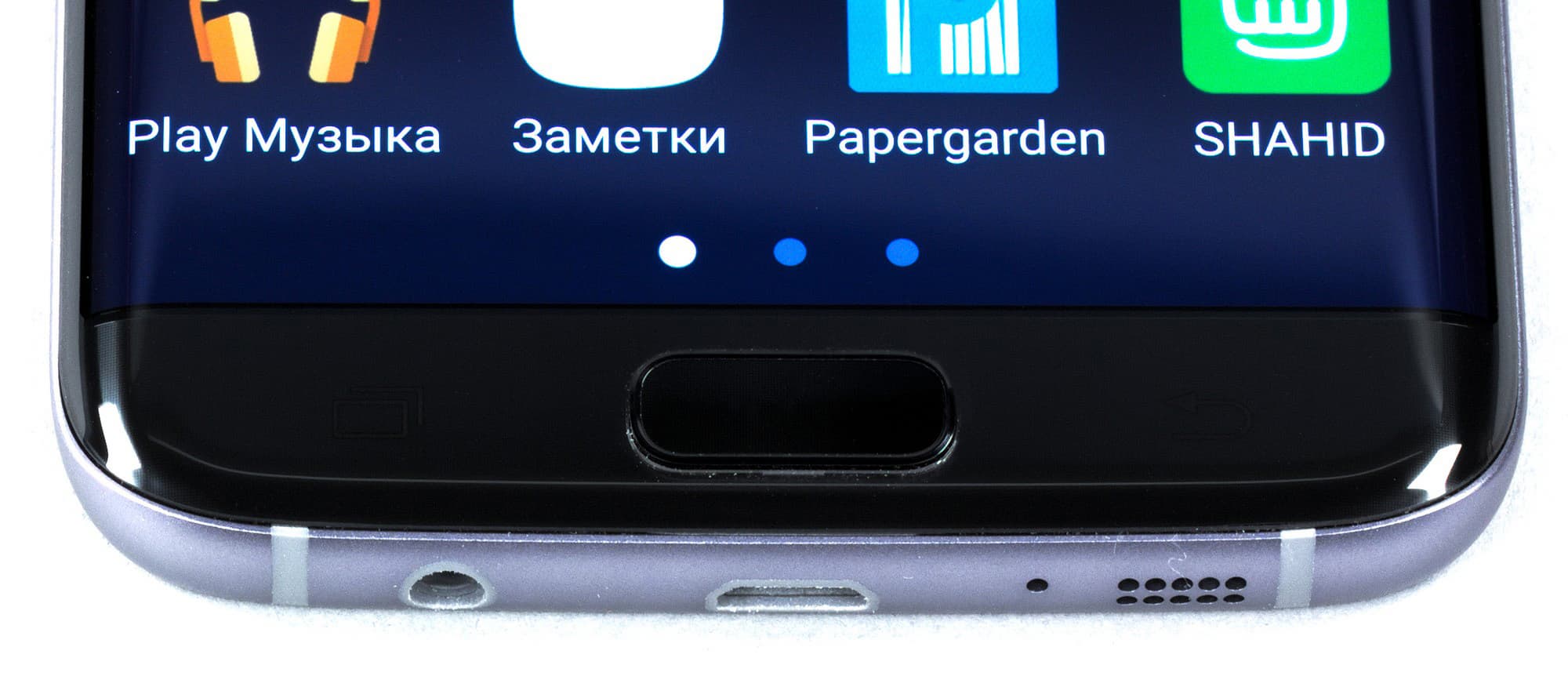 И фронтальная, и задняя панели полностью закрыты стеклами. Они довольно маркие, особенно если речь о черной версии смартфона (в продаже также будет серебристая и «платиновая» версии), но все равно выглядят здорово. Очень узкие зоны снизу и сверху над экраном — это тоже плюс. Благодаря этому при одинаковых размерах экрана Samsung Galaxy S7 Edge оказывается существенно более компактным, чем iPhone 6s Plus. Правда, iPhone совсем чуть-чуть потоньше, но это совершенно незаметно. А благодаря сужению боковых граней смартфон Samsung кажется даже тоньше устройства Apple.