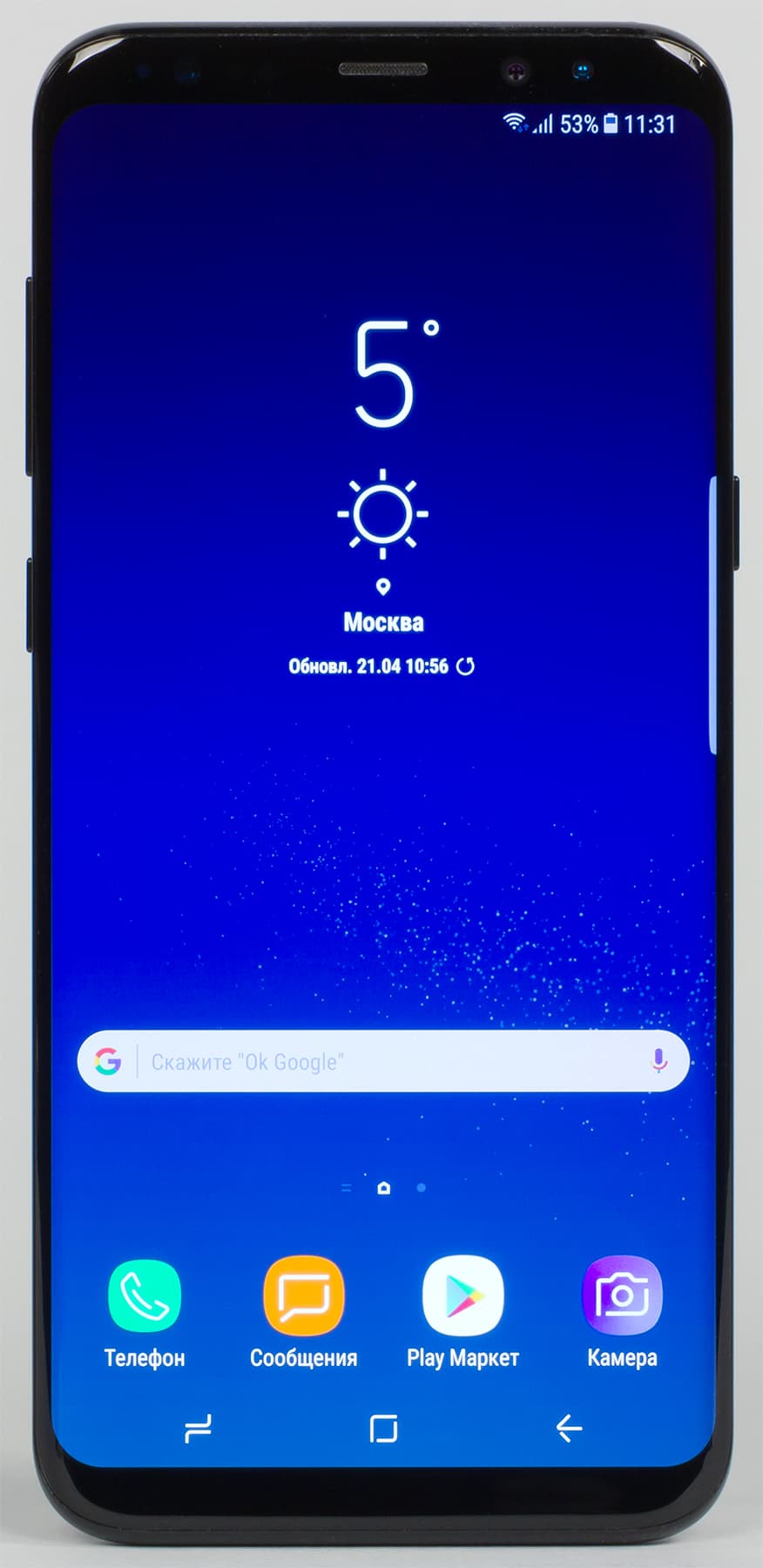 Цветопередача хорошая, цвета в меру насыщенные, цветовой баланс у экранов немного различается. Напомним, что фотография не может служить надежным источником сведений о качестве цветопередачи и приводится только для условной наглядной иллюстрации. В частности, выраженный красноватый оттенок белого и серого полей, присутствующий на фотографиях экрана Samsung Galaxy S8+, при перпендикулярном взгляде визуально отсутствует, что подтверждается аппаратными тестами с помощью спектрофотометра. Причина в том, что спектральная чувствительность матрицы фотоаппарата неточно совпадает с этой характеристикой человеческого зрения. Заметим, что в данном случае картинка занимает в высоту (при этой ориентации экрана) всю доступную для вывода изображения область и заходит на загнутые края экрана, что приводит к затемнению и искажению цвета. Также на свету эти области почти всегда бликуют, что еще больше мешает при просмотре изображений, выведенных на весь экран. И даже картинка фильмов с соотношением сторон 16:9 заходит на загибы, что сильно мешает при просмотре кино.