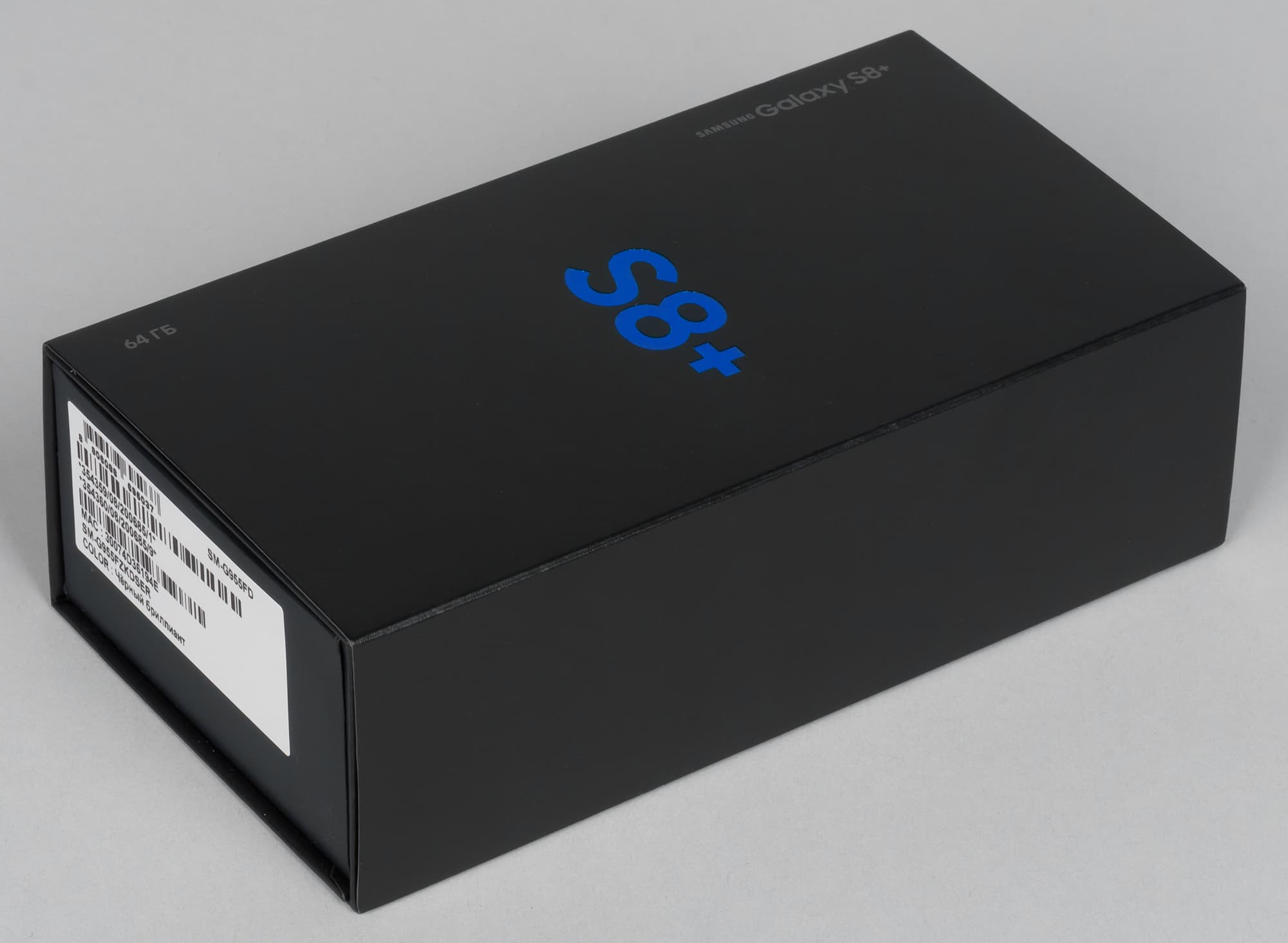 Samsung Galaxy S8+ получил в качестве упаковки стильно оформленную матовую черную картонную коробку с лаконичным оформлением. Крышка не снимается полностью, она откидывается на манер шкатулки. Содержимое аккуратно расфасовано по отдельным ячейкам.