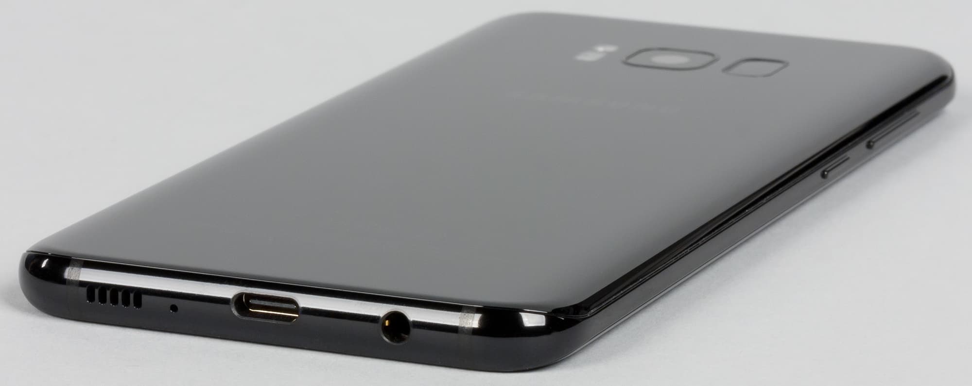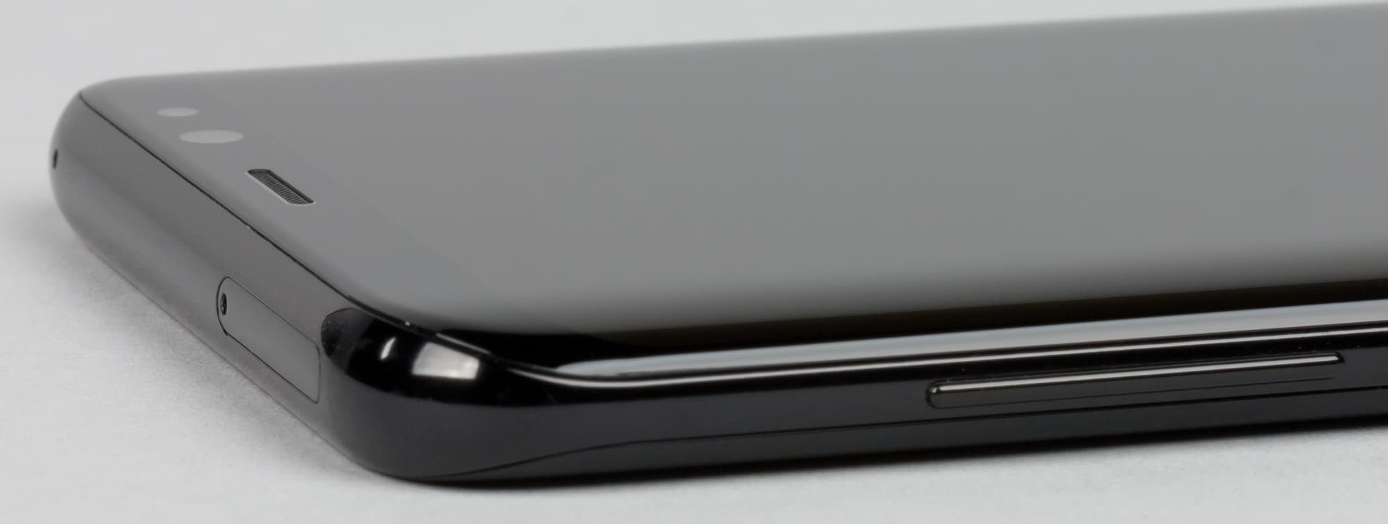 Дизайн Samsung Galaxy S8/S8+ получился необычным и привлекательным. Обтекаемый корпус полностью выполнен из металла и стекла, пластика здесь нет. Закругленная со всех сторон металлическая рамка, симметрично сужающаяся по бокам и расширяющаяся на верхнем и нижнем торцах, соединяет две стеклянных панели — переднюю и заднюю. В качестве покрытия использовано стекло Gorilla Glass 5, стекла имеют заметные закругления по бокам. Рамка в передней плоскости экрана полностью скрывается за изгибом стекла, поэтому тут можно говорить об истинно безрамочном варианте.