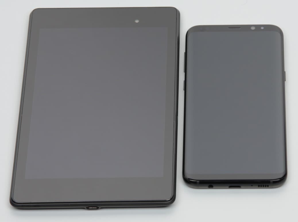 Лицевая поверхность экрана выполнена в виде стеклянной пластины с зеркально-гладкой поверхностью, устойчивой к появлению царапин. Судя по отражению объектов, антибликовые свойства экрана лучше, чем у экрана Google Nexus 7 (2013) (далее просто Nexus 7). Для наглядности приведем фотографию, на которой в выключенных экранах отражается белая поверхность (слева — Nexus 7, справа — Samsung Galaxy S8+, далее их можно различать по размеру):