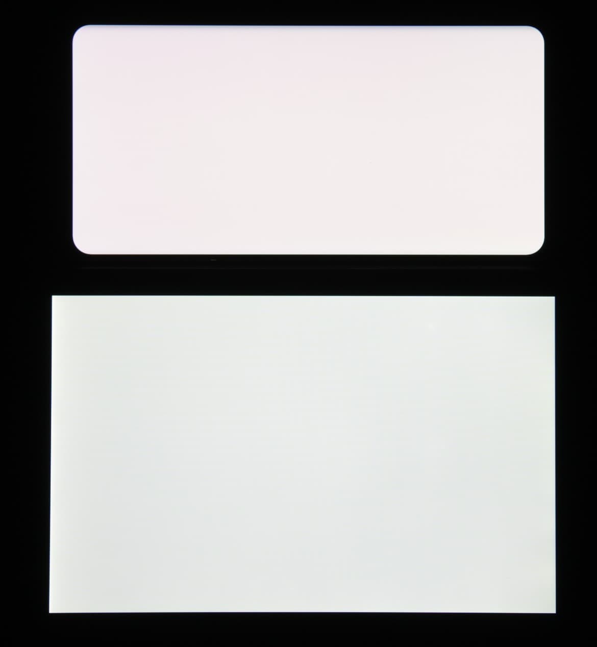 Экран характеризуется великолепными углами обзора. Правда, белый цвет при отклонении даже на небольшие углы поочередно приобретает легкий сине-зеленый и розоватый оттенок, но черный цвет остается просто черным под любыми углами. Он настолько черный, что параметр контрастности в данном случае неприменим. Для сравнения приведем фотографии, на которых на экраны Samsung Galaxy S8+ (профиль Основной) и второго участника сравнения выведены одинаковые изображения, при этом яркость экранов изначально установлена примерно на 200 кд/м², а цветовой баланс на фотоаппарате принудительно переключен на 6500 К.