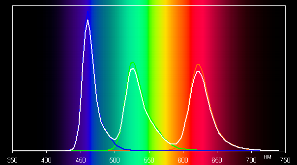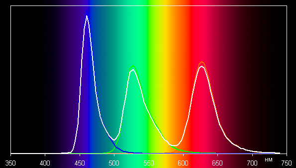 Спектры типичны для OLED — области первичных цветов хорошо разделены и имеют вид относительно узких пиков: