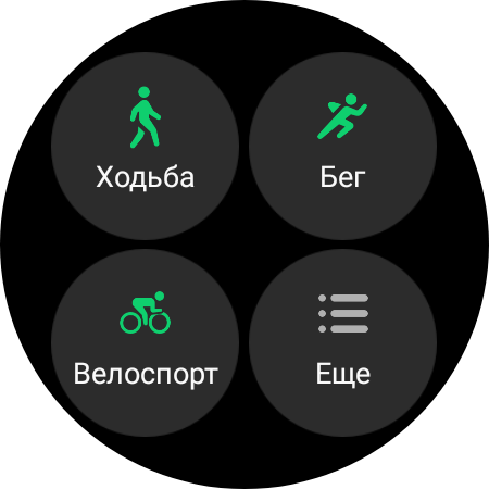 Добавим, что интерфейс изрядно отличается от того, что мы видели в Tizen. Иконки приложений по-прежнему круглые, но расположены они не по внешнему кругу, как раньше, а просто тремя вертикальными рядами. И вот одна странность: среди иконок нет той, которая бы запускала тренировки! Чтобы перейти к тренировкам, вам надо сделать свайп справа налево и открыть отдельный экран (см. скриншот ниже справа).