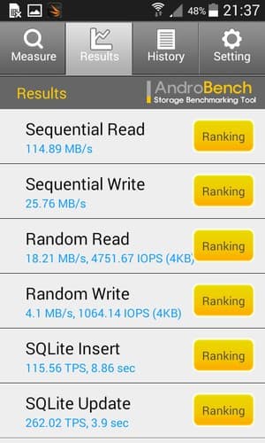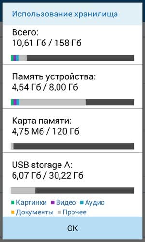 Оперативной памяти в устройстве предусмотрено 1,5 ГБ, в распоряжении пользователя около 5,2 ГБ свободного флэш-массива. Возможность расширения памяти за счет карточек предусмотрена, поддерживаются карточки объемом до 64 ГБ. Впрочем, на практике наша проверочная карта Transcend Premium microSDXC UHS-1 объемом 128 ГБ уверенно распозналась устройством. Также есть возможность подключения к порту Micro-USB в режиме OTG, так что в целом возможности по расширению доступного объема памяти у Samsung Galaxy Xcover 3 весьма широки.