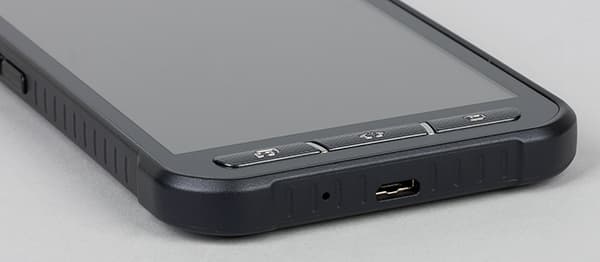 Остальные механические кнопки также привычно разместились по бокам устройства: рядом с синей кнопкой Xcover на левой грани установлена раздельная клавиша регулировки громкости, а справа находится кнопка питания и блокировки. Все боковые механические кнопки имеют шероховатое, текстурированное мелкими пупырышками покрытие, клавиши выступают за пределы корпуса на достаточную высоту, легко находятся на ощупь, имеют податливый, но в меру упругий ход, в целом никаких претензий к механическим элементам управления нет.