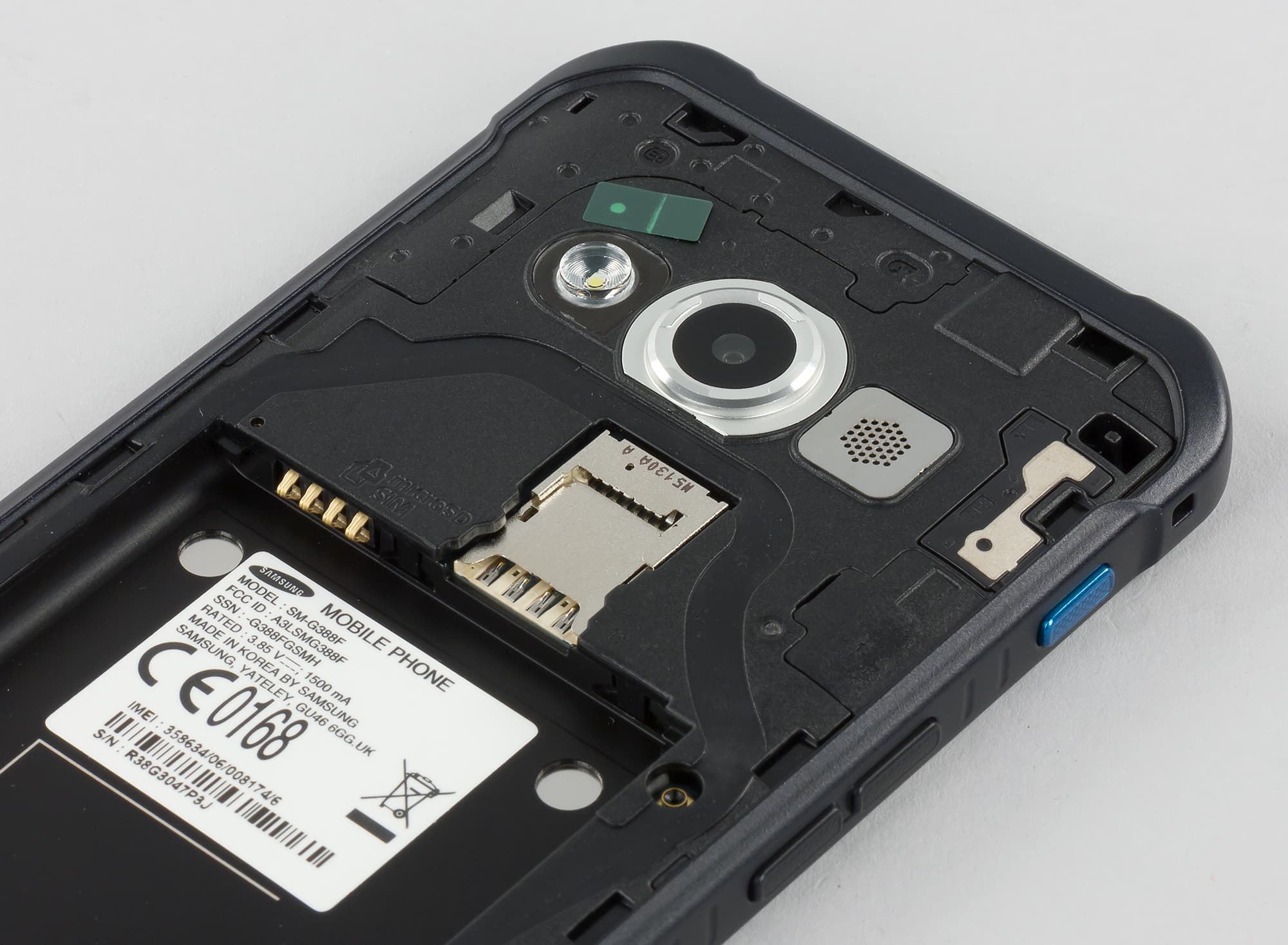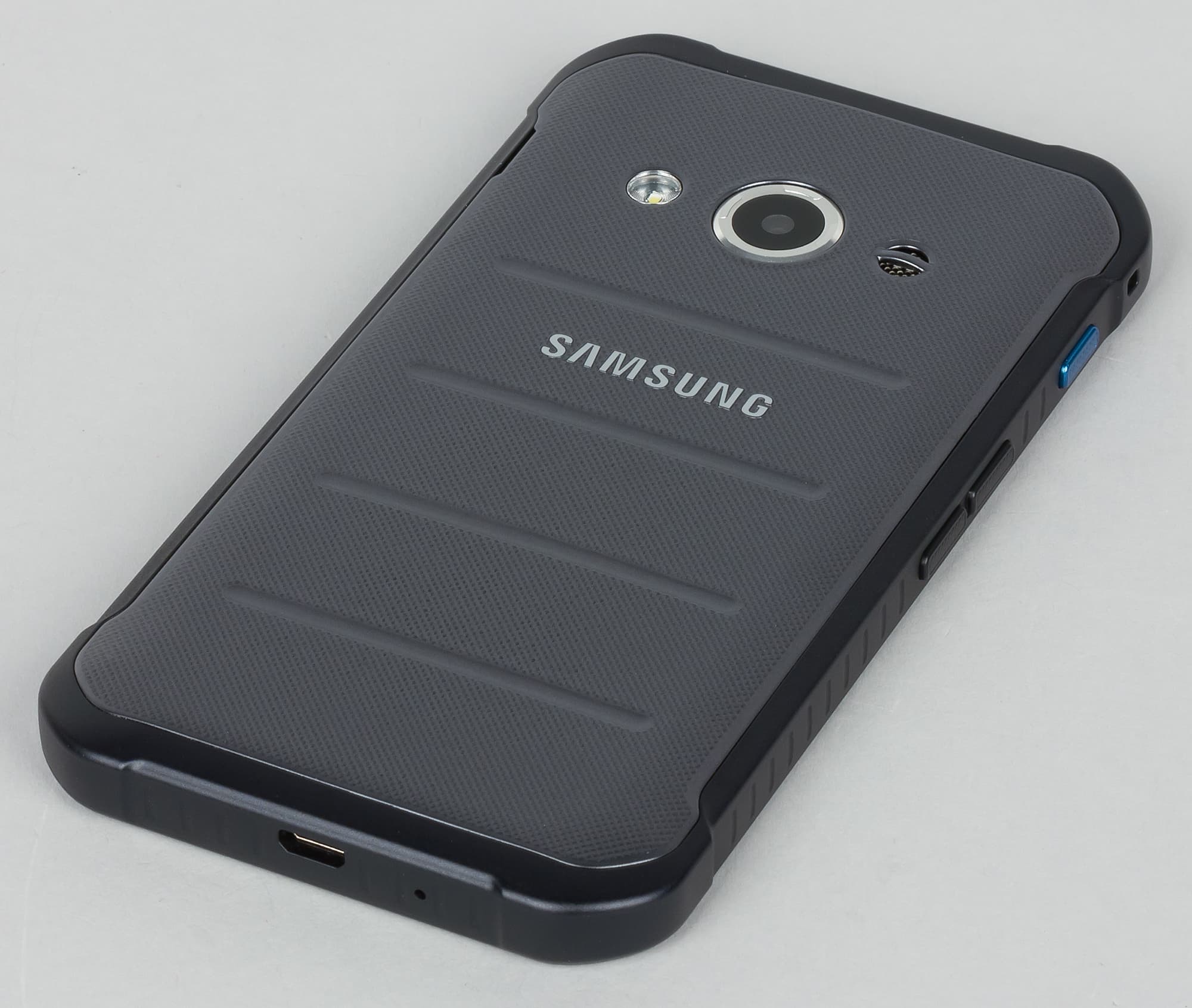 На задней стороне корпуса расположились глазки основной камеры и одиночной светодиодной вспышки. Стекло камеры обрамлено металлическим защитным колечком. Вспышка может играть роль фонарика, по умолчанию он включается с помощью дополнительной кнопки Xcover на боку, имеющей отличный от других, синий цвет. Правда, срабатывает данная кнопка, только когда смартфон разблокирован, а при выключенном экране нажатие на эту кнопку ничего не дает. Кнопка Xcover програмируемая, она выполняет разные действия при коротком и длинном нажатии, а привязанные функции назначаются в соответствующем пункте меню.