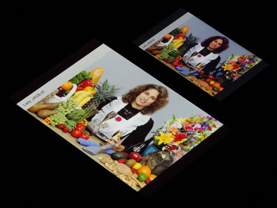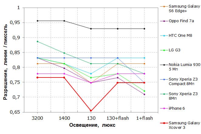 Видно, что цвета не сильно изменились у обоих экранов, но контраст на экране Samsung Galaxy Xcover 3 заметно снизился из-за значительного повышения уровня черного и общего снижения яркости. И белое поле: