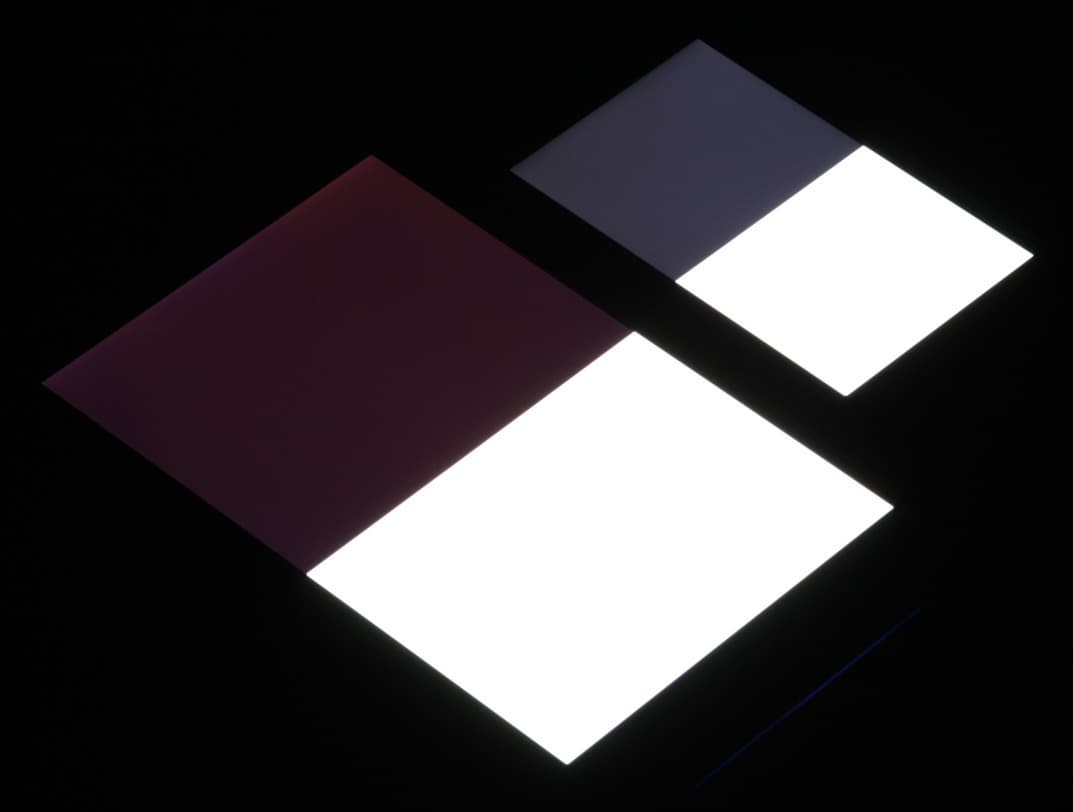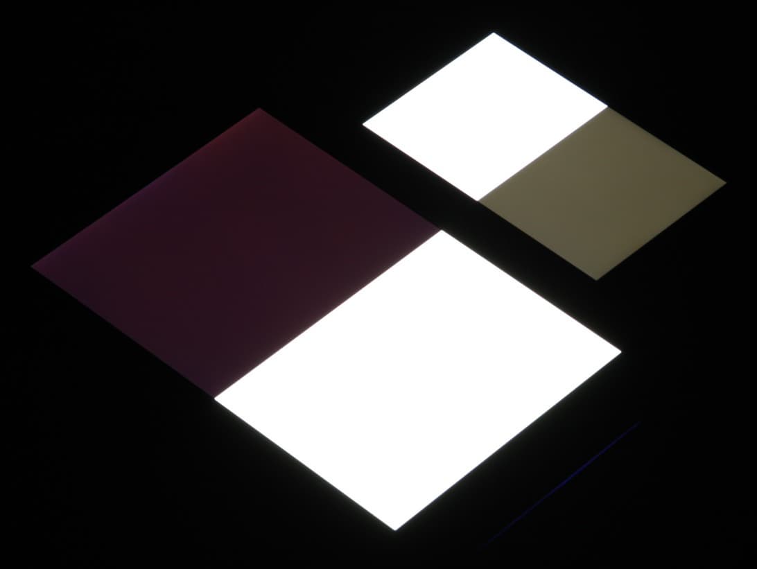 Яркость под углом у экранов уменьшилась (как минимум в пять раз, исходя из разницы в выдержке), однако в случае Samsung Galaxy Xcover 3 яркость снизилась заметно больше. Черное поле при отклонении по диагонали высветляется сильно, и приобретает зеленоватый или фиолетовый оттенок. Фотографии ниже это демонстрируют (яркость белых участков в перпендикулярном плоскости экранов направлении у экранов одинаковая!):