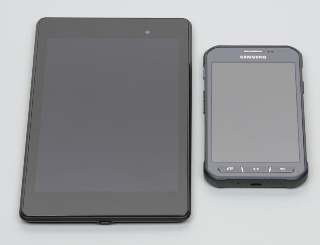 Лицевая поверхность экрана выполнена в виде стеклянной пластины с зеркально-гладкой поверхностью, устойчивой к появлению царапин. Судя по отражению объектов антибликовые свойства экрана заметно хуже, чем у экрана Google Nexus 7 (2013) (далее просто Nexus 7). Поверхность самой матрицы под стеклом слегка матовая, поэтому экран отражает как прямые источники света (внешней поверхностью), так и рассеянный свет (поверхностью матрицы), это уменьшает читаемость в условиях сильной внешней засветки. Для наглядности приведем фотографию, на которой в выключенных экранах отражается белая поверхность (слева — Nexus 7, справа — Samsung Galaxy Xcover 3, далее их можно различать по размеру):
