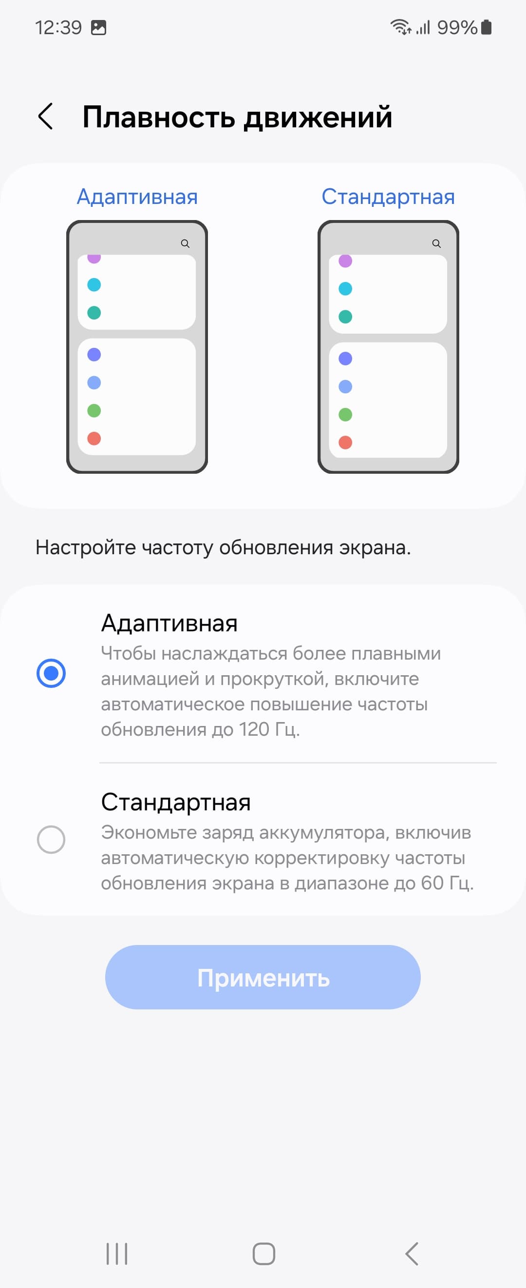 В настройках для основного экрана можно включить режим с повышенной до 120 Гц частотой обновления. В этом режиме как минимум увеличивается плавность прокрутки списков в меню.