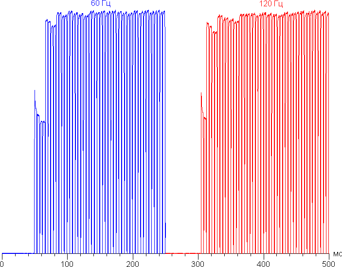 Переключение состояния элементов матрицы выполняется практически мгновенно, но на фронте включения может присутствовать ступенька шириной примерно 17 мс (что соответствует частоте обновления экрана примерно в 60 Гц) или примерно 8 мс (120 Гц). Например, так выглядит зависимость яркости от времени при переходе от черного к белому (режим 60 Гц и 120 Гц, основной экран):