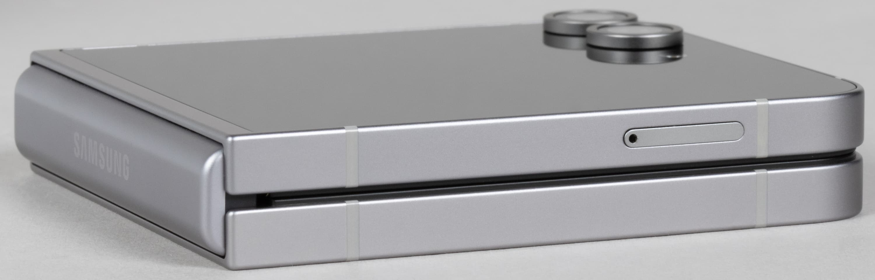 Но есть и минусы: раскладушка-то она раскладушка, но совсем не та, что были в прошлом. Samsung Galaxy Z Flip6 совершенно невозможно изящно расхлопнуть одной рукой, пальцам просто не за что зацепиться. А попытки изловчиться и все-таки сделать это почти наверняка закончатся падением аппарата на пол. В общем, плоские грани без выемок для пальцев заставляют раскрывать аппарат только двумя руками.
