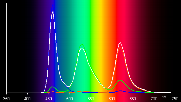 Без коррекции (профиль Насыщенные цвета) спектры компонент хорошо разделены (хотя какое-то подмешивание зеленого к красному есть):