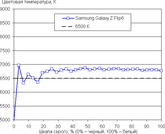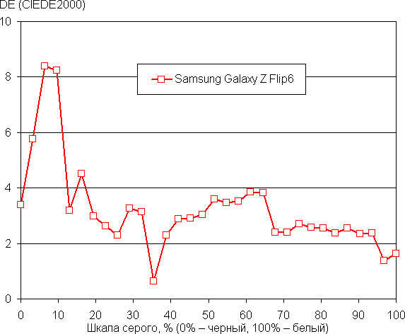 Напомним, что в случае OLED-экранов яркость фрагментов изображения динамично меняется в соответствии с характером выводимого изображения — уменьшается для светлых в целом изображений. В итоге полученная зависимость яркости от оттенка (гамма-кривая), скорее всего, немного не соответствует гамма-кривой статичного изображения, так как измерения проводились при последовательном выводе оттенков серого почти на весь экран.