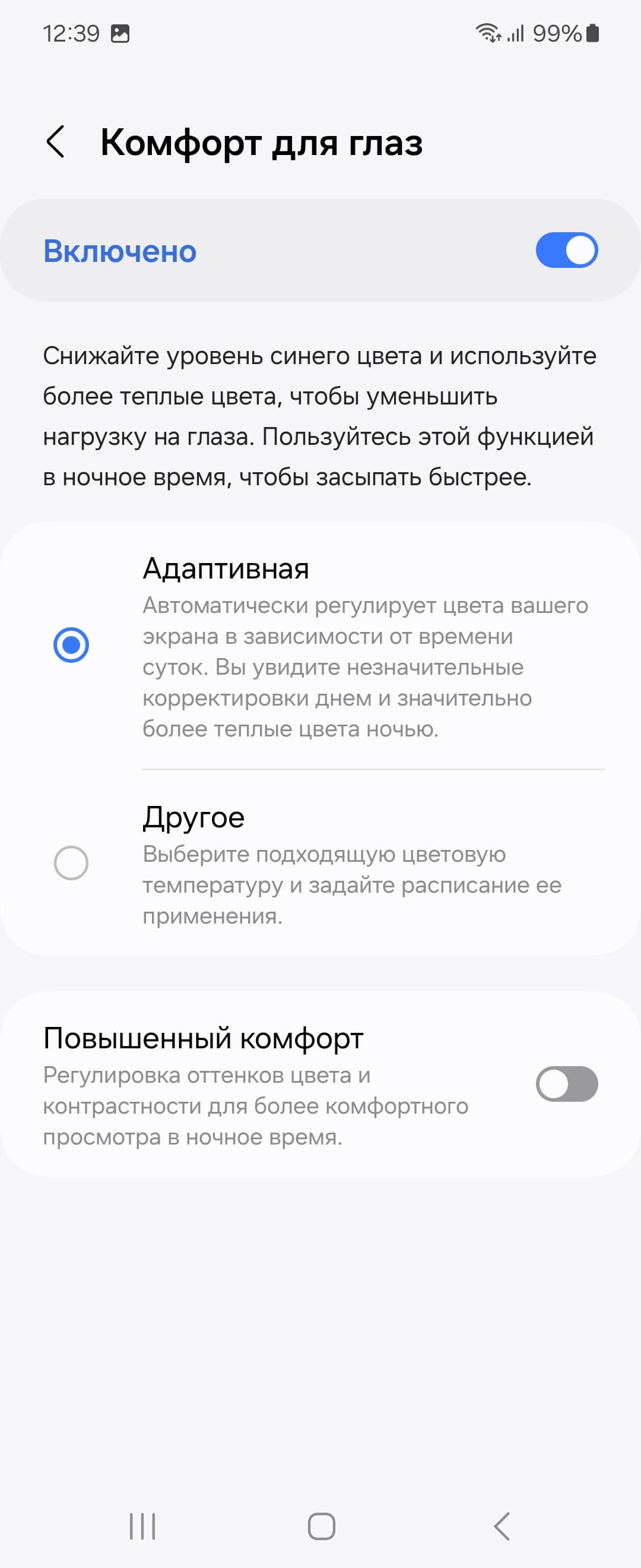 Есть функция Комфорт для глаз, для которой в настройках даже приведено более-менее корректное описание: