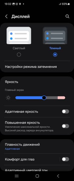 В случае основного экрана при выводе белого поля во весь экран и при ручном управлении яркостью ее максимальное значение составило всего 410 кд/м², однако при включении режима Повышенная яркость максимальная яркость увеличивается до 700 кд/м², а на очень ярком свету и в случае автоматической регулировки оно повышается до 1200 кд/м². Максимальная яркость очень высокая. Для этого экрана производитель заявляет максимальную яркость в 2600 кд/м², но, видимо, это не для случая белого поля во весь экран. Нужно учитывать тот факт, что в данном случае чем меньше площадь белого на экране, тем он светлее, то есть фактическая максимальная яркость белых участков будет почти всегда выше указанного значения. В итоге читаемость экрана днем на солнце должна быть на отличном уровне, а темная тема не только экономит заряд аккумулятора, но способствует лучшей разборчивости информации на экране в условиях высокой освещенности. Минимальное значение — 0,8 кд/м², то есть пониженный уровень яркости без проблем позволяет использовать устройство даже в полной темноте. Работает автоматическая регулировка яркости по датчику освещенности (он расположен под экраном левее камеры). Работа этой функции зависит от положения ползунка регулировки яркости: им пользователь может попытаться выставить желаемый уровень яркости в текущих условиях. Если оставить все по умолчанию, то в полной темноте функция автояркости уменьшает яркость до 10 кд/м² (сойдет), в условиях освещенного искусственным светом офиса (примерно 550 лк) устанавливает на 100 кд/м² (нормально), а условно под прямыми лучами солнца повышает до 1200 кд/м² (до максимума, так и нужно). Ради эксперимента в полной темноте мы чуть уменьшили яркость и провели цикл измерений. Установленное значение яркости в темноте сохранилось, в офисе практически не изменилось, а на ярком свету всегда повышалось до максимума. Получается, что функция автоподстройки яркости работает адекватно и в какой-то степени позволяет пользователю настраивать свою работу под индивидуальные требования.