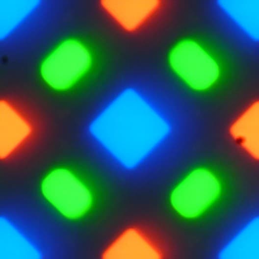На фрагменте выше можно насчитать 4 зеленых субпикселя, 2 красных (4 половинки) и 2 синих (1 целый и 4 четвертушки), при этом, повторяя эти фрагменты, можно выложить весь экран без разрывов и перехлеста. Для таких матриц компания Samsung ввела наименование PenTile RGBG. Разрешение экрана производитель считает по зеленым субпикселям, по двум другим оно будет ниже. Присутствуют некоторая неровность контрастных границ и другие артефакты, но из-за высокого разрешения они лишь минимально сказываются на качестве изображения.