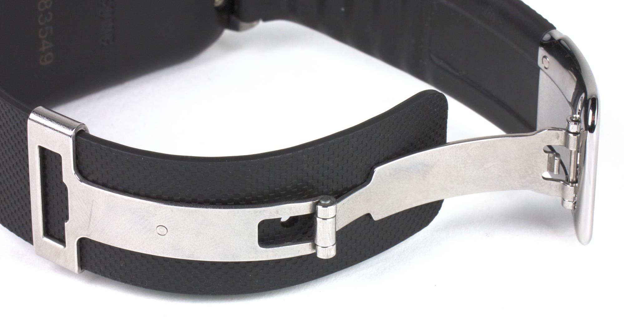 Силиконовый ремешок у часов имеет застежку того же типа, что и у Galaxy Gear. Сам же материал ремешка (плотный силикон) достаточно приятный на ощупь. Внутренняя его поверхность, соприкасающаяся с рукой, ребристая, а внешняя имеет мелкое рифление.
