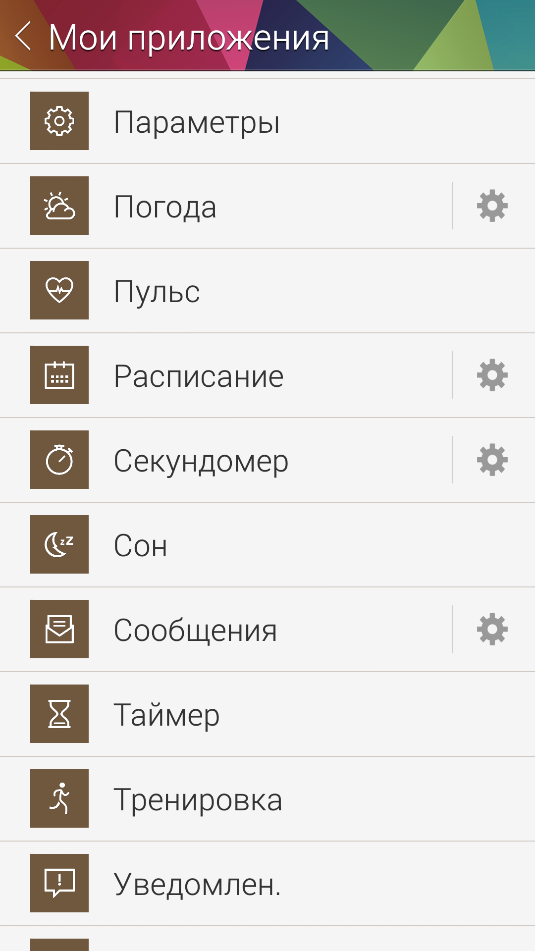 «Найти мой Gear» посылает сигнал на часы, заставляя их издавать звук (у Gear Fit динамика нет, поэтому звук они издавать не могут). «Мои приложения» — это список установленных приложений, и для некоторых из них есть дополнительные настройки. Но самое интересное — «Samsung Apps». Это каталог приложений для Gear 2, написанных преимущественно сторонними разработчиками.