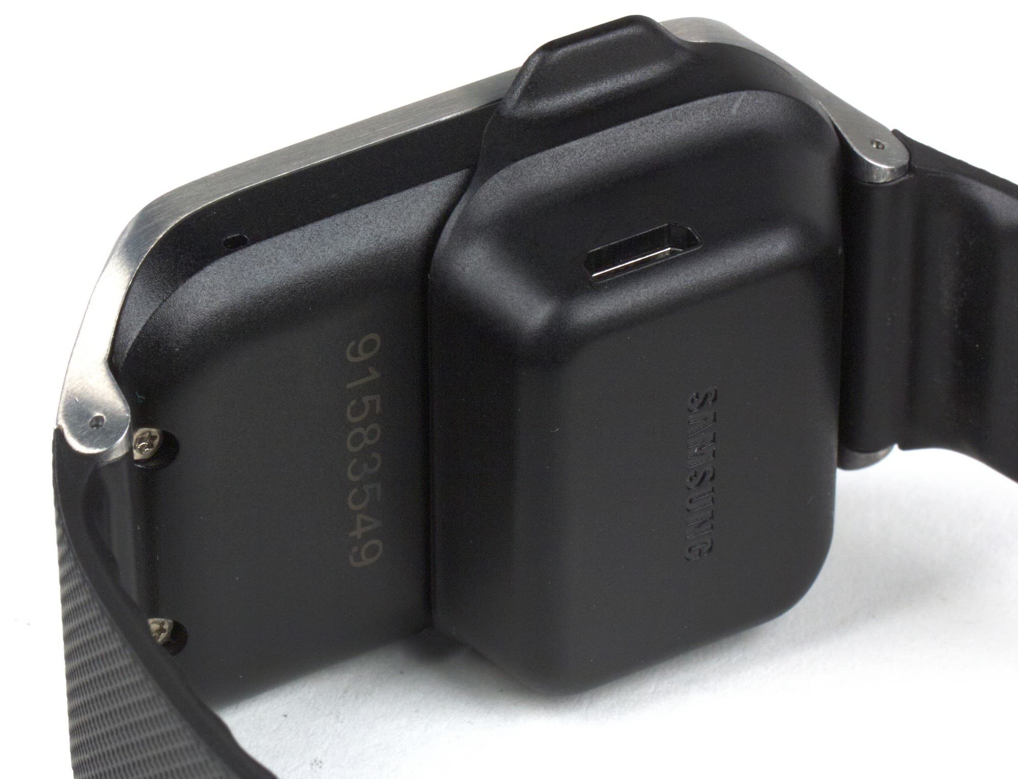 С правой стороны на насадке имеется разъем Micro-USB, к которому и подключается зарядное устройство (подойдет любая зарядка для смартфона). Отметим, что в первой версии часов Gear зарядный блок был решен в виде дополнительного пластикового футляра, который надевался на часы. Это решение гораздо менее удобное.