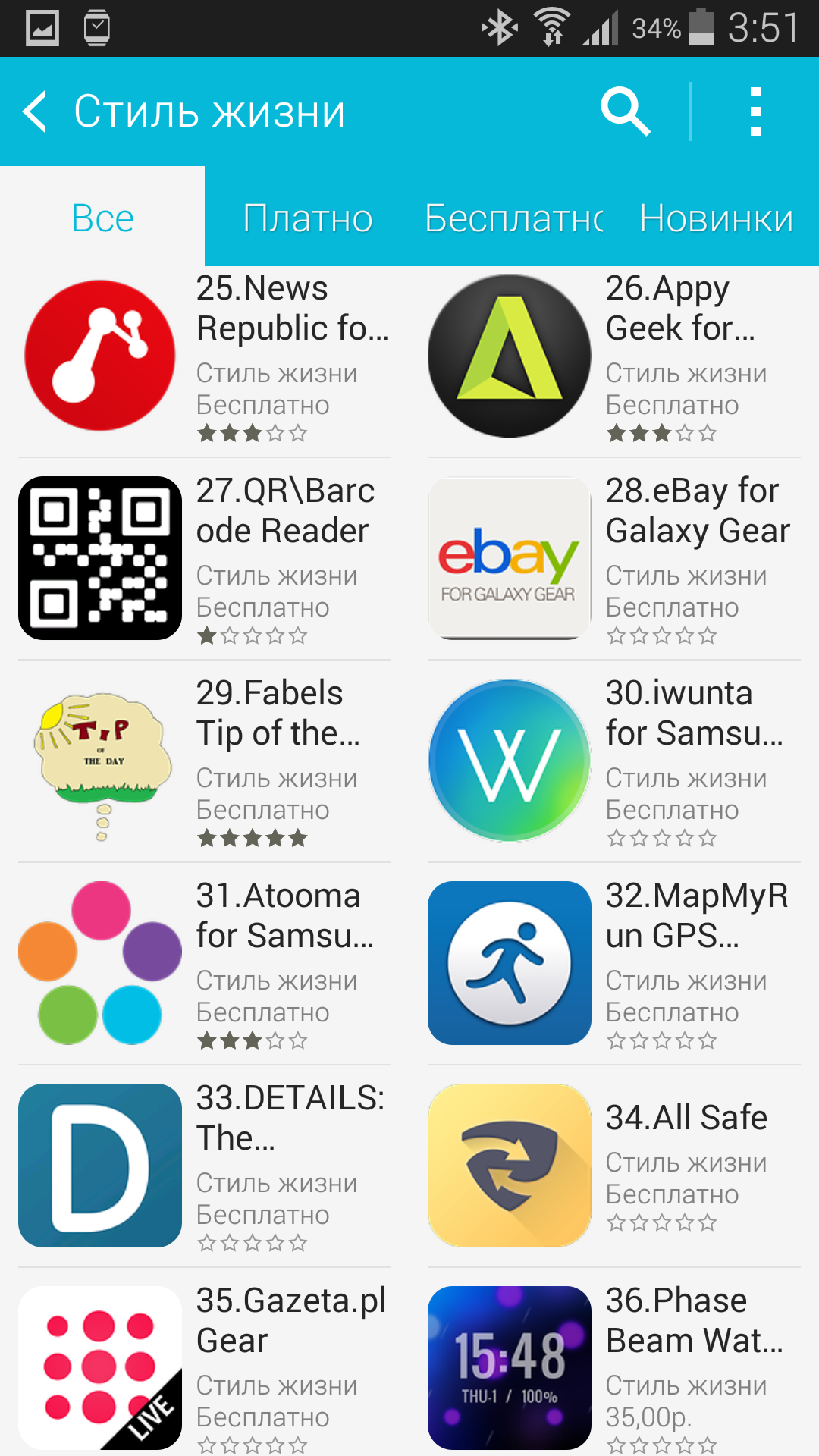 Приложения рассортированы по семи категориям. На данный момент общее количество приложений превышает сотню. Установка их на часы — элементарна: выбираем нужное приложение, жмем на кнопку с ценой (если приложение платное) или словом «бесплатно». Как только загрузка закончится, приложение уже будет в ваших часах (раздел «Приложения»), а также в меню «Мои приложения» в Gear Manager. Удалить установленное приложение можно только через смартфон. Впрочем, делается это очень просто и интуитивно.