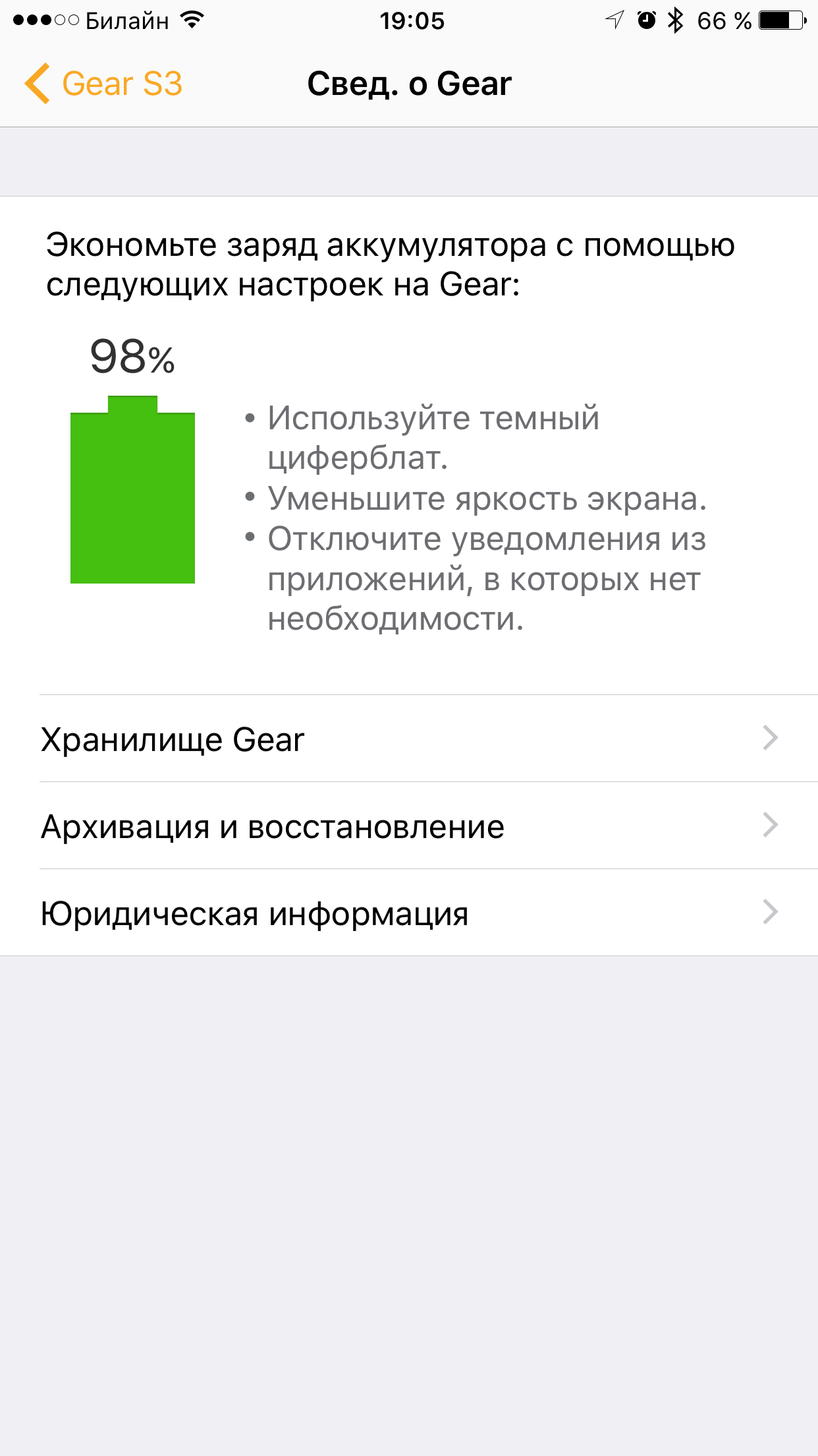 В среднем при использовании Gear S3 в связке с устройством компании Samsung часы работают около 2 дней. Это хороший показатель, особенно если учесть, что дисплей, Bluetooth, GPS и Wi-Fi всегда включены. В «обычном» режиме, когда экран включается только при использовании часов, Gear S3 способны прожить до 4 дней.
