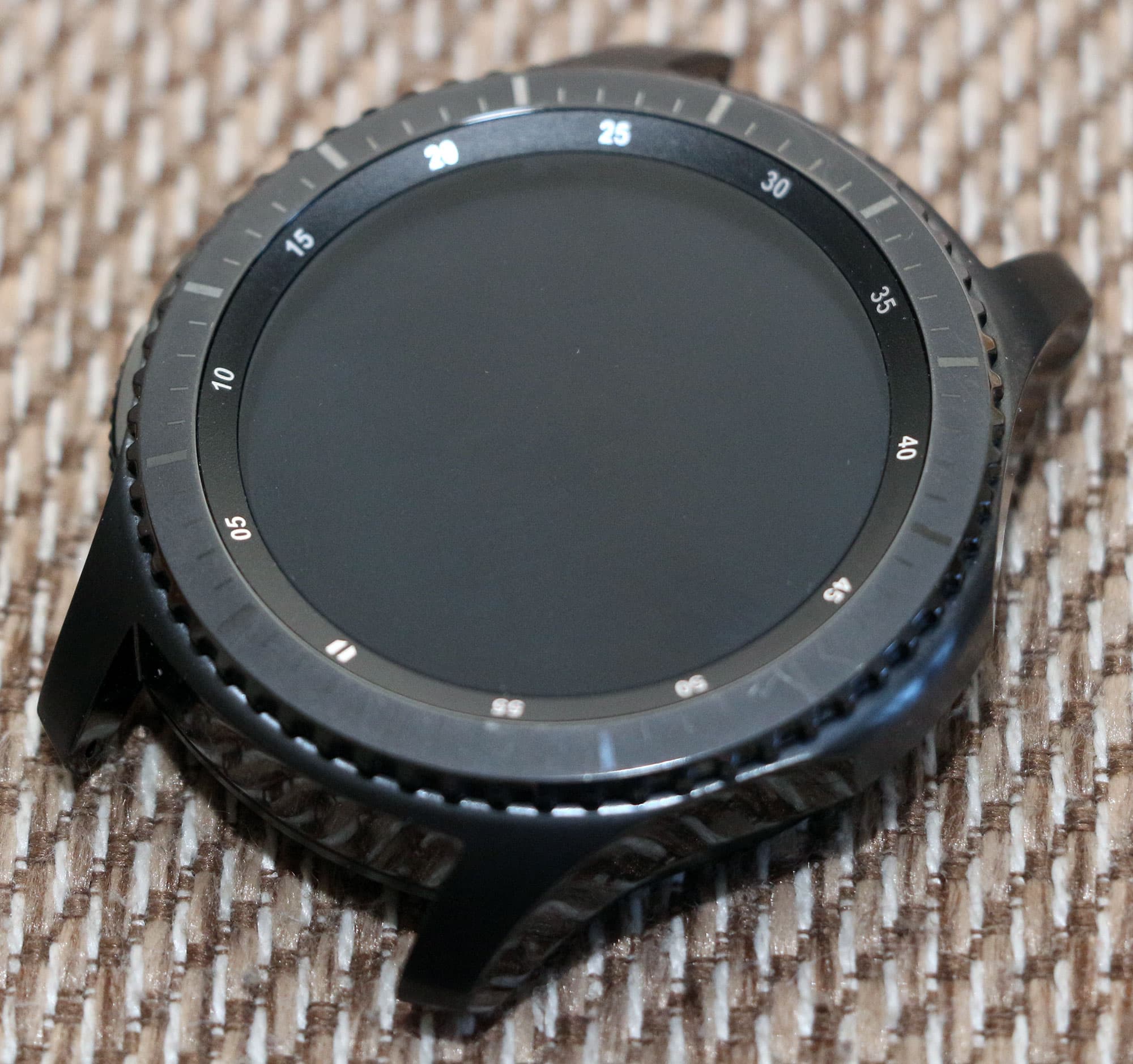 Frontier-версия смотрится брутально. Как и в Gear S2, экран часов круглый и без каких-либо «мертвых зон». Корпус стальной, серый. Управлять Gear S3 можно как при помощи ободка (безеля), так и «перелистыванием» на самом экране. Если у вас тонкая рука, возможно, стоит присмотреться к версии Classic — она на несколько миллиметров у́же. Например, на руке автора статьи Frontier смотрелись чересчур громоздко.