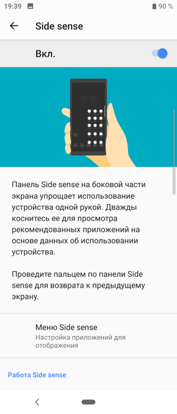 Из уникального стоит отметить наличие Side Sense — боковой панели, упрощающей работу с экраном одной рукой. В принципе, в самой идее уменьшения рабочей площади экрана или виртуальной кнопки, разворачивающейся в меню быстрого доступа к самым важным функциям, нет ничего нового, они используются повсеместно. Необычно лишь их объединение, а также уникальное и довольно удобное оформление, хотя Side Sense задумывалась для экранов с загнутыми краями, а не плоских, как здесь. Но хуже от этого не стало, потому что случайно ничего не нажимается и не вызывается, и это хорошо.