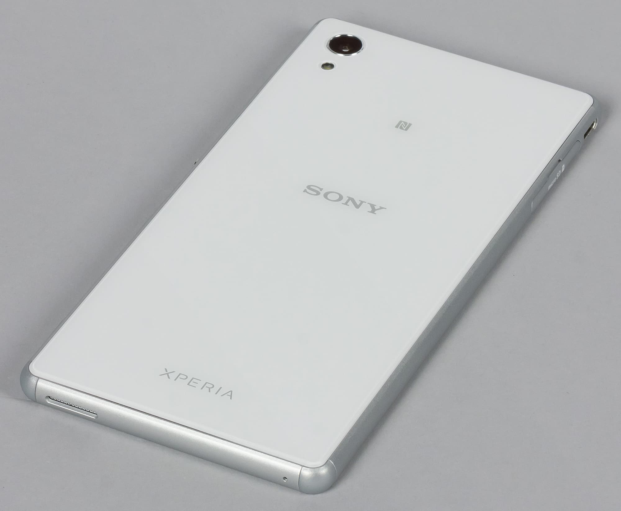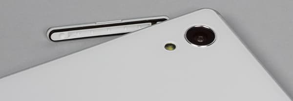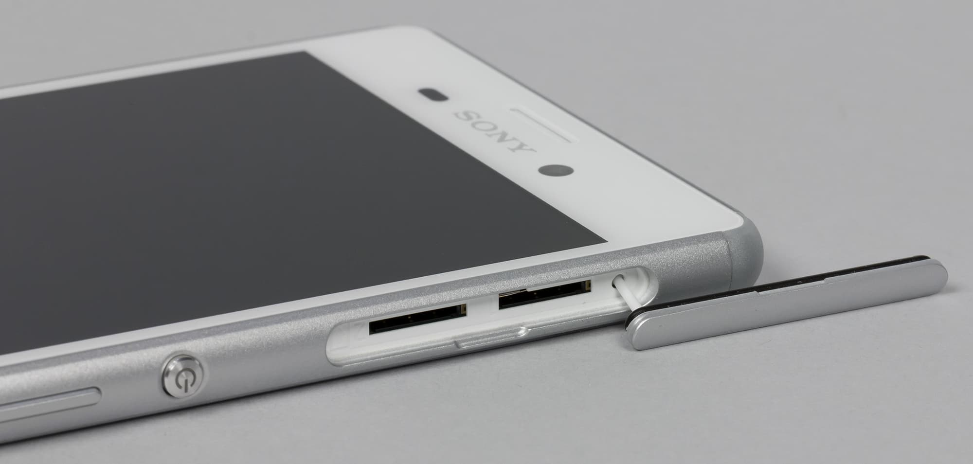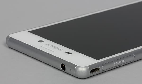 Карточки, как и у остальных моделей Sony, вставляются в боковые разъемы, только, в отличие от флагманских моделей, здесь нет пластиковых выдвижных поддонов. Слоты имеют подпружиненные механизмы захвата, карточки необходимо вдавливать ногтем до характерного щелчка, порой приходится прибегать к помощи сторонних предметов. В данном случае используется вариант с установкой одновременно двух SIM-карт формата Nano-SIM и одной карты памяти формата microSD. Слоты для карточек разнесены по разным граням и прикрыты пластмассовыми крышками с резиновыми прокладками.