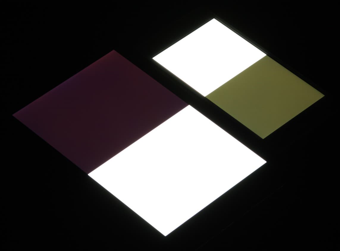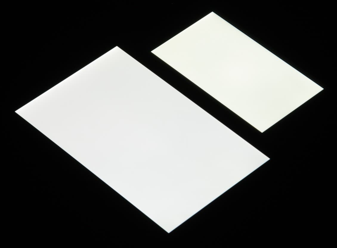 Яркость под углом у экранов уменьшилась (как минимум в 5 раз, исходя из разницы в выдержке), но в случае Sony Xperia M4 Aqua Dual падение яркости меньше. Черное поле при отклонении по диагонали высветляется сильно и приобретает зеленоватый оттенок или остается почти нейтрально-серым. Фотографии ниже это демонстрируют (яркость белых участков в перпендикулярном плоскости экранов направлении примерно одинаковая!):