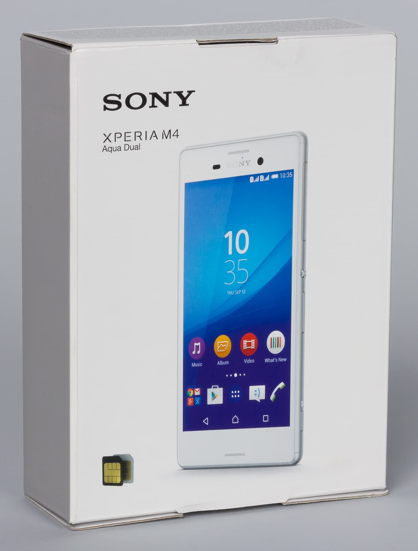 Смартфон Sony Xperia М4 Aqua Dual поставляется в продажу в очень простой плоской утилитарного вида коробке из тонкого нелакированного картона. Упаковки смартфонов Sony часто имеют невзрачный малопривлекательный вид, этим как бы подчеркивается стремление компании заботиться об окружающей среде, ведь такая коробка в основном сделана из переработанных материалов с применением соевых чернил (легко разлагающихся после утилизации).