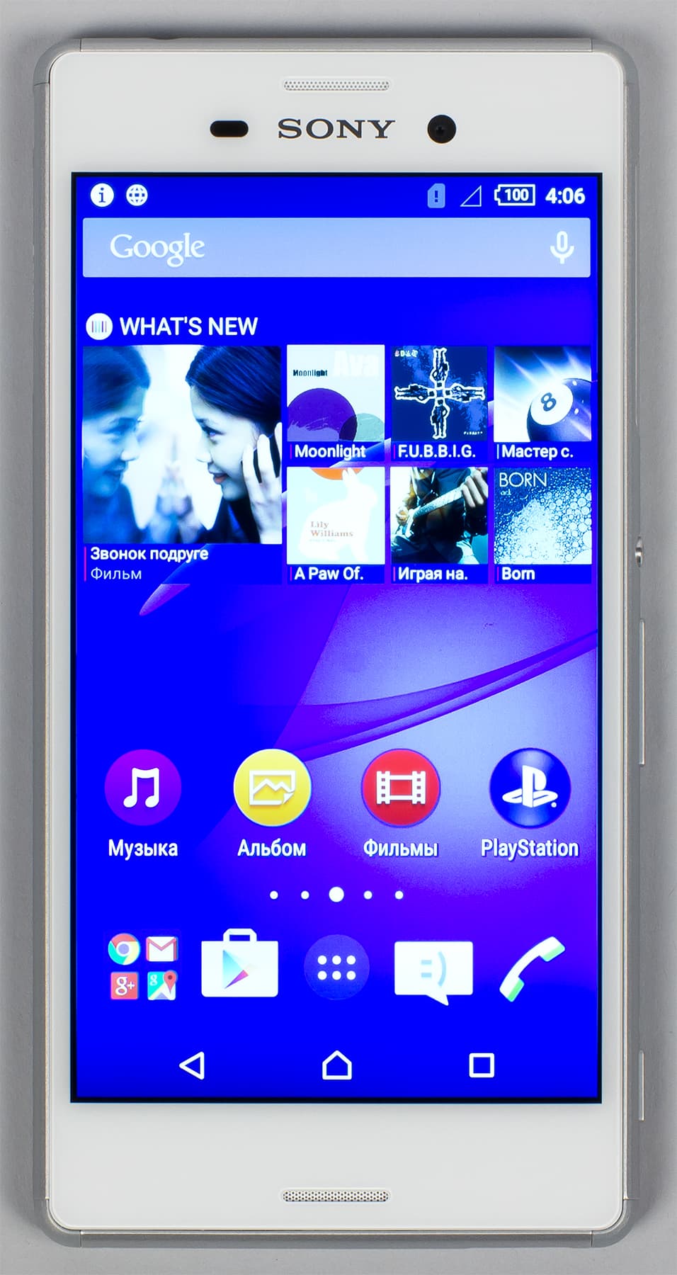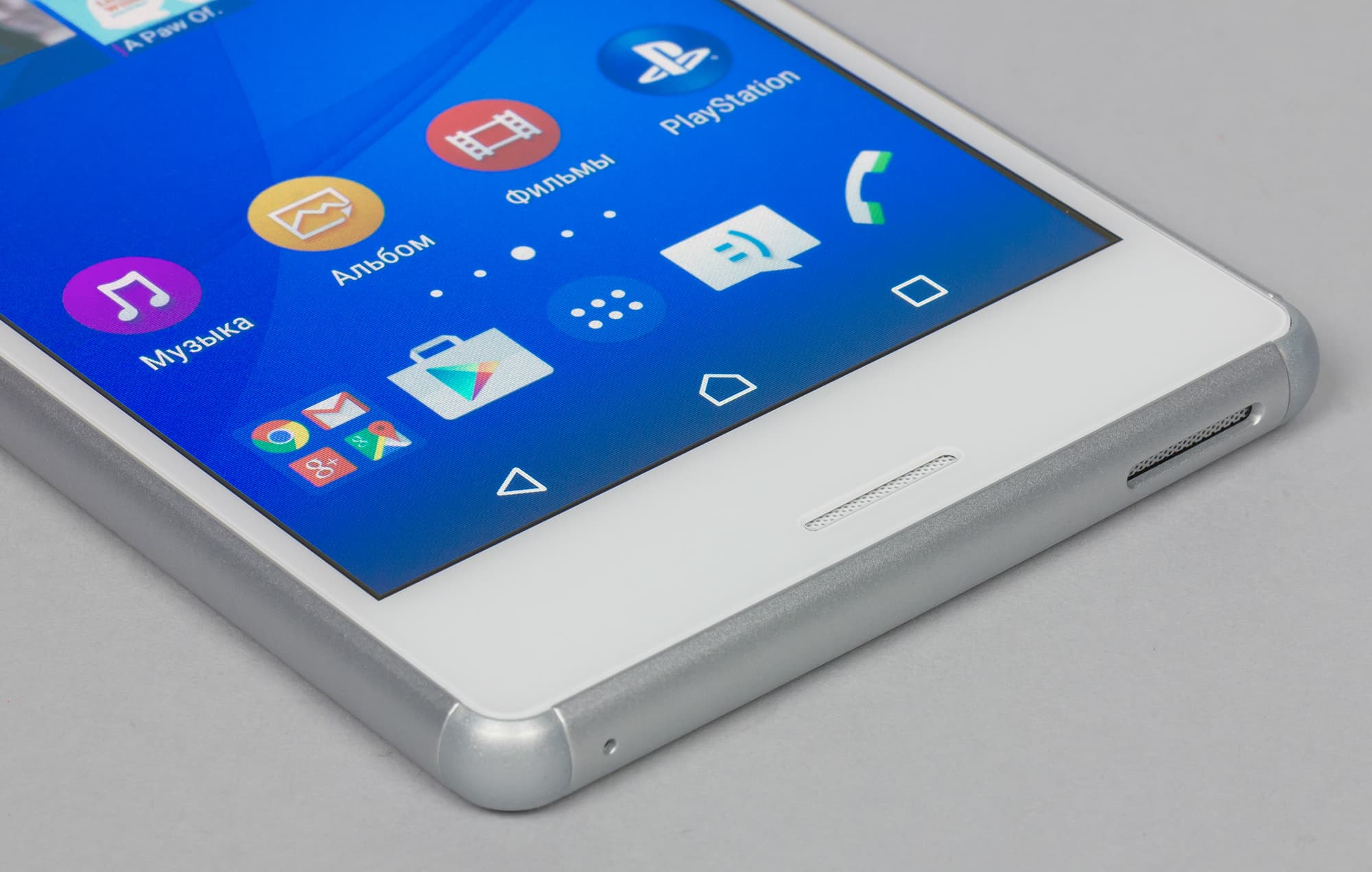 Любопытно, что несмотря на две симметричные решетки на передней панели, звук основного динамика выходит не через них, как это реализовано во флагманах Sony, а через отдельную, третью решетку, врезанную в нижний торец. Фронтальные же решетки скрывают под собой разговорный динамик и микрофон. Сенсорных кнопок на передней панели нет — кнопки используются виртуальные, на экране.