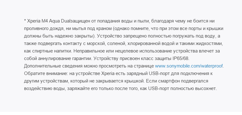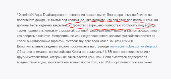 Отныне, согласно тому же официальному описанию, защищенное от попадания воды и пыли устройство «не боится ни проливного дождя, ни мытья под краном», но при этом «неправильное или нецелевое использование устройства влечет за собой аннулирование гарантии». Понятно, что сервисные центры Sony успели намучаться с недобросовестными пользователями, нарушающими условия эксплуатации во время купания, но при чем здесь тогда защита IP68? Ведь соответствие степени защиты IP68 предполагает, что изделие пригодно для длительного погружения в воду на глубину более 1 м.