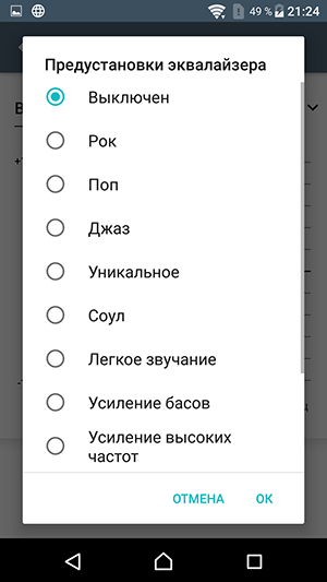 Для проигрывания музыкальных композиций в аппарате используется собственный плеер со знакомым набором настроек: пользователю традиционно предоставляется выбор между ручной регулировкой и автоматической оптимизацией всех параметров звучания с помощью комплексной функции ClearAudio+. В нее входит масса разнообразных технологий, подробнее об этом можно прочитать на отдельной странице сайта Sony, посвященной звуковым технологиям, применяемым во всех современных топовых смартфонах производителя.