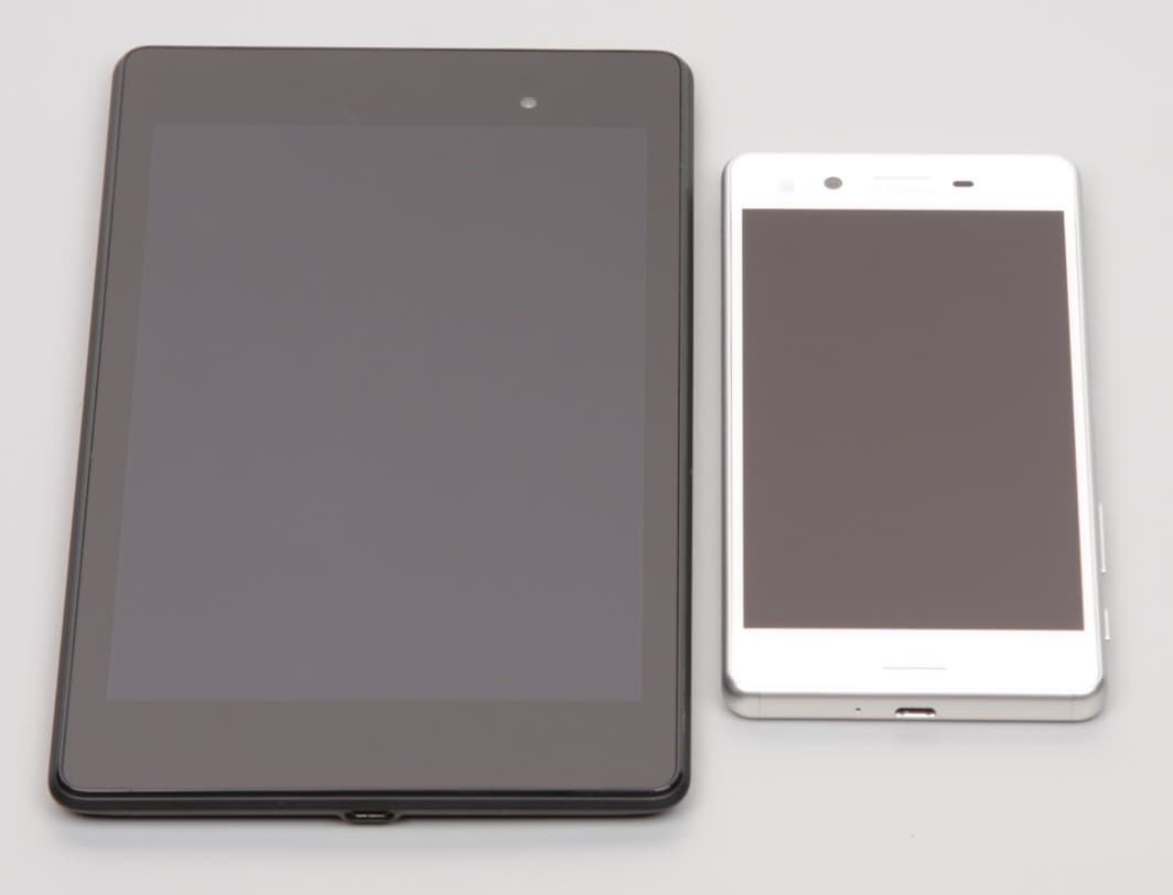 Лицевая поверхность экрана выполнена в виде стеклянной пластины с зеркально-гладкой поверхностью, устойчивой к появлению царапин. Судя по отражению объектов антибликовые свойства экрана лучше, чем у экрана Google Nexus 7 (2013) (далее просто Nexus 7). Для наглядности приведем фотографию, на которой в выключенных экранах обоих устройств отражается белая поверхность (Sony Xperia X Performance, как нетрудно определить, справа, далее их можно различать по размеру):